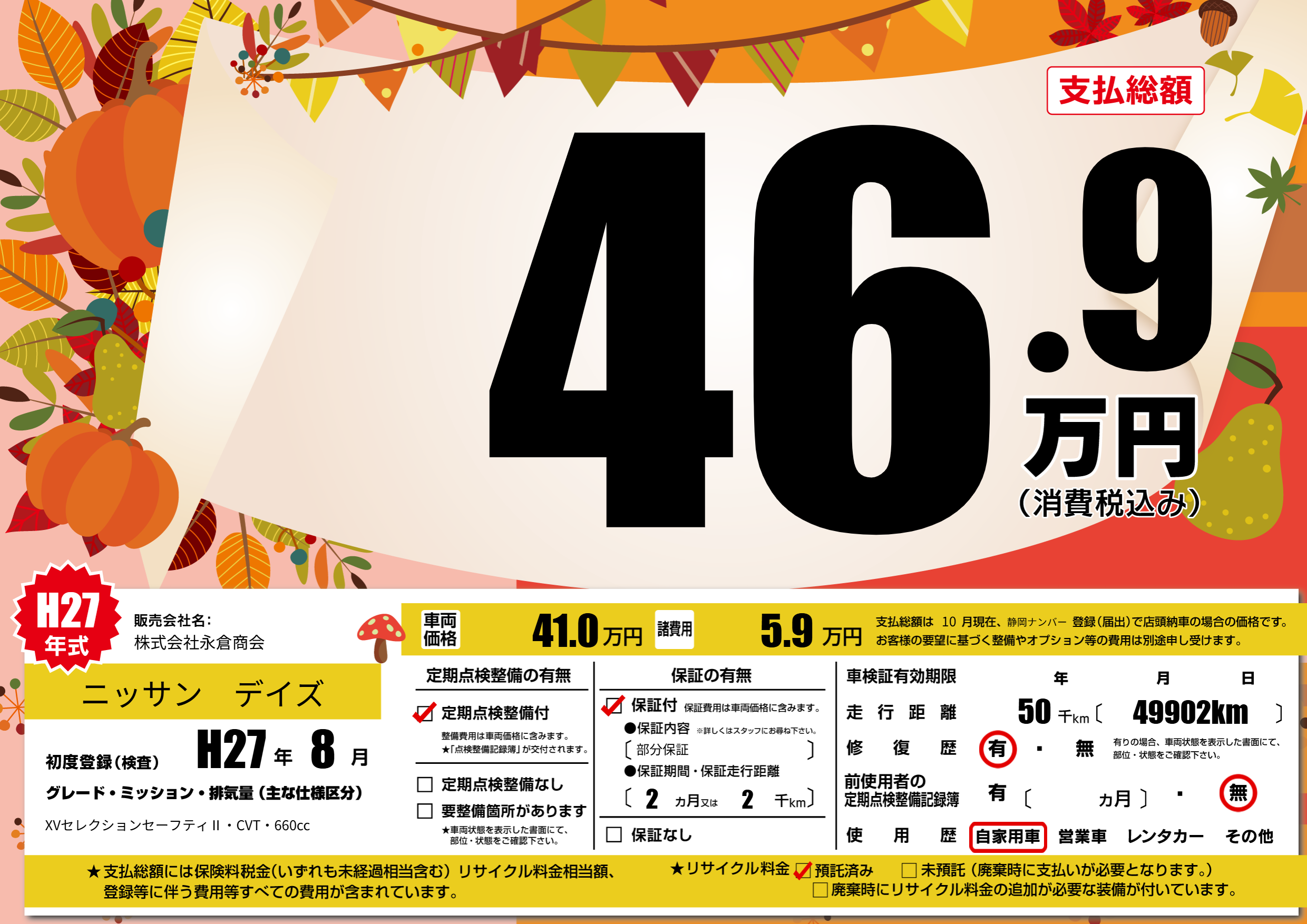 | 走行キロ | 5万km | 初年度登録 | H27年8月 |