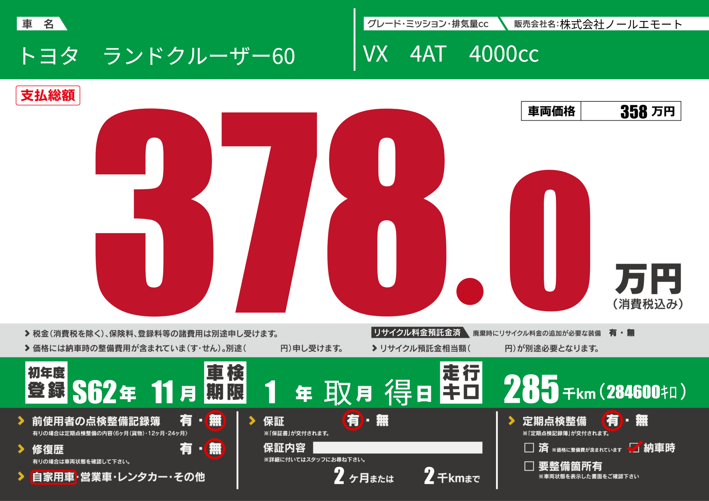 | 走行キロ | 28.5万km | 初年度登録 | S62年11月 |
