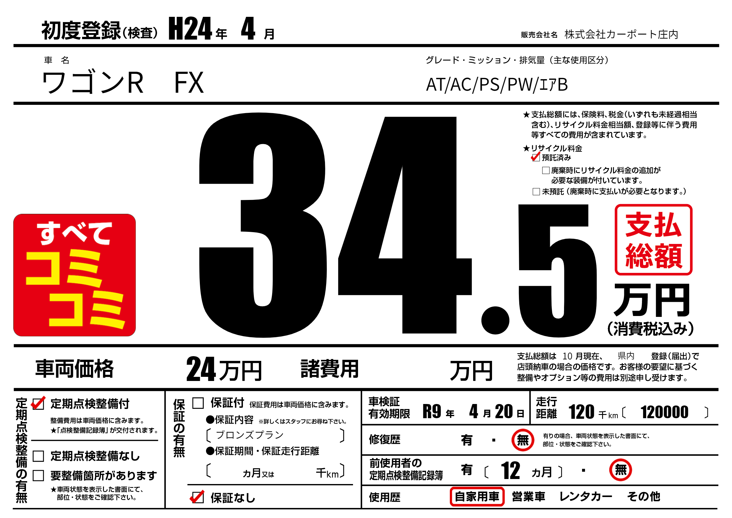 | 車名 | ワゴンR FX | グレード ミッション 排気量 |