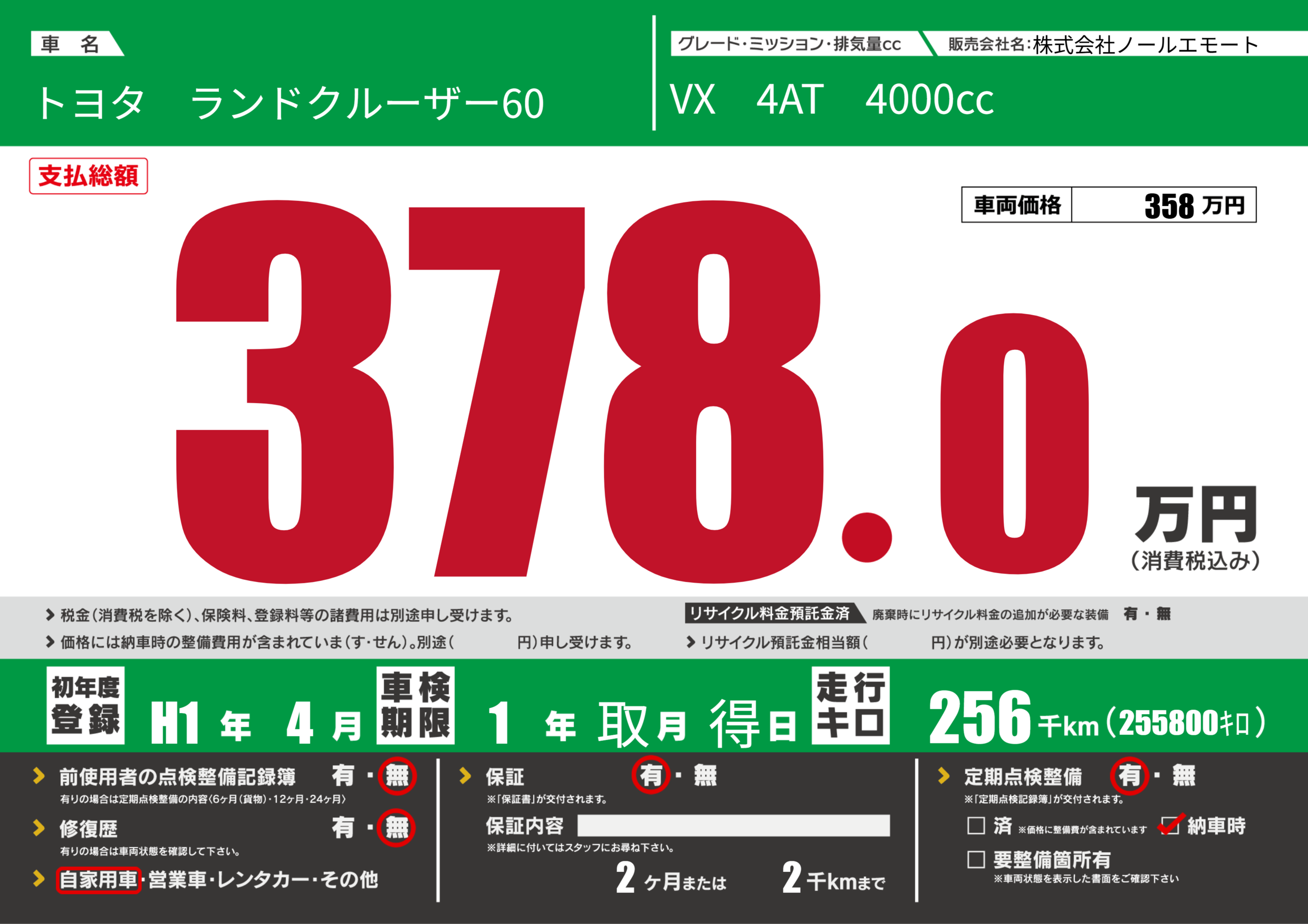 | 走行キロ | 25.6万km | 初年度登録 | H1年4月 |