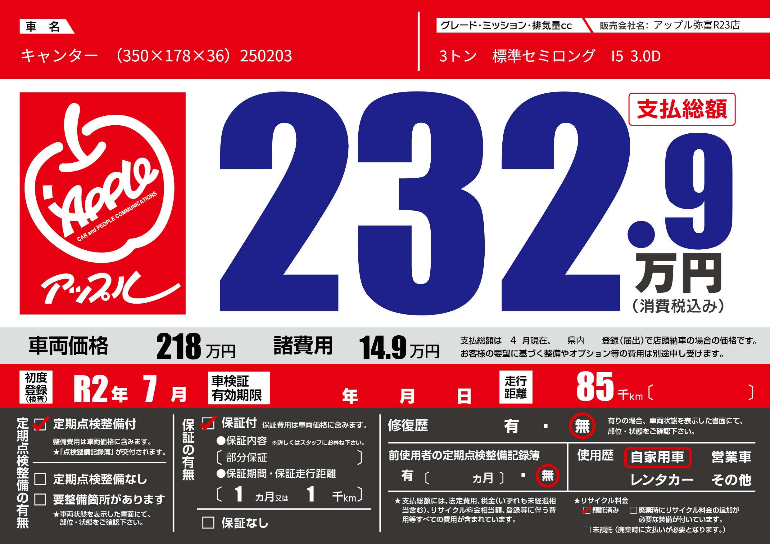 | 車名 | キャンター (350×178×36)250203 | グレード ミッション 排気量 |