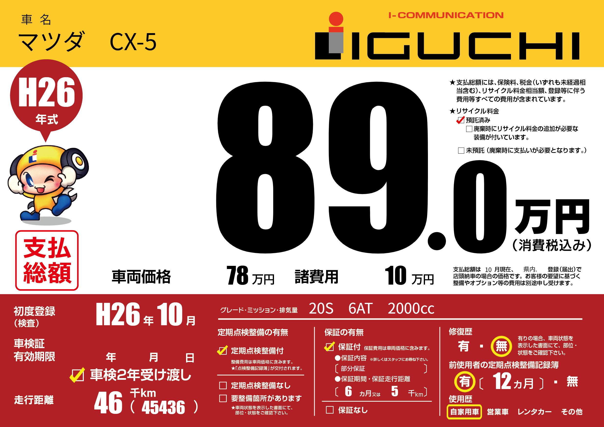 | 車名 | マツダ CX-5 | グレード ミッション 排気量 |