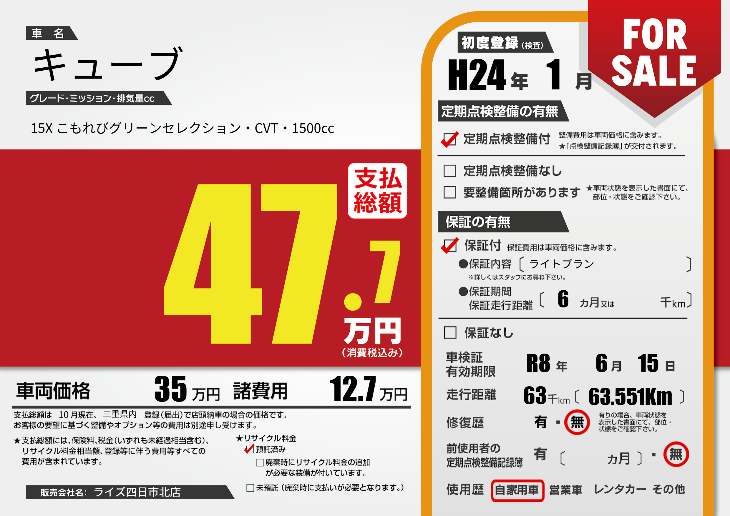 | 車名 | キューブ | グレード ミッション 排気量 |