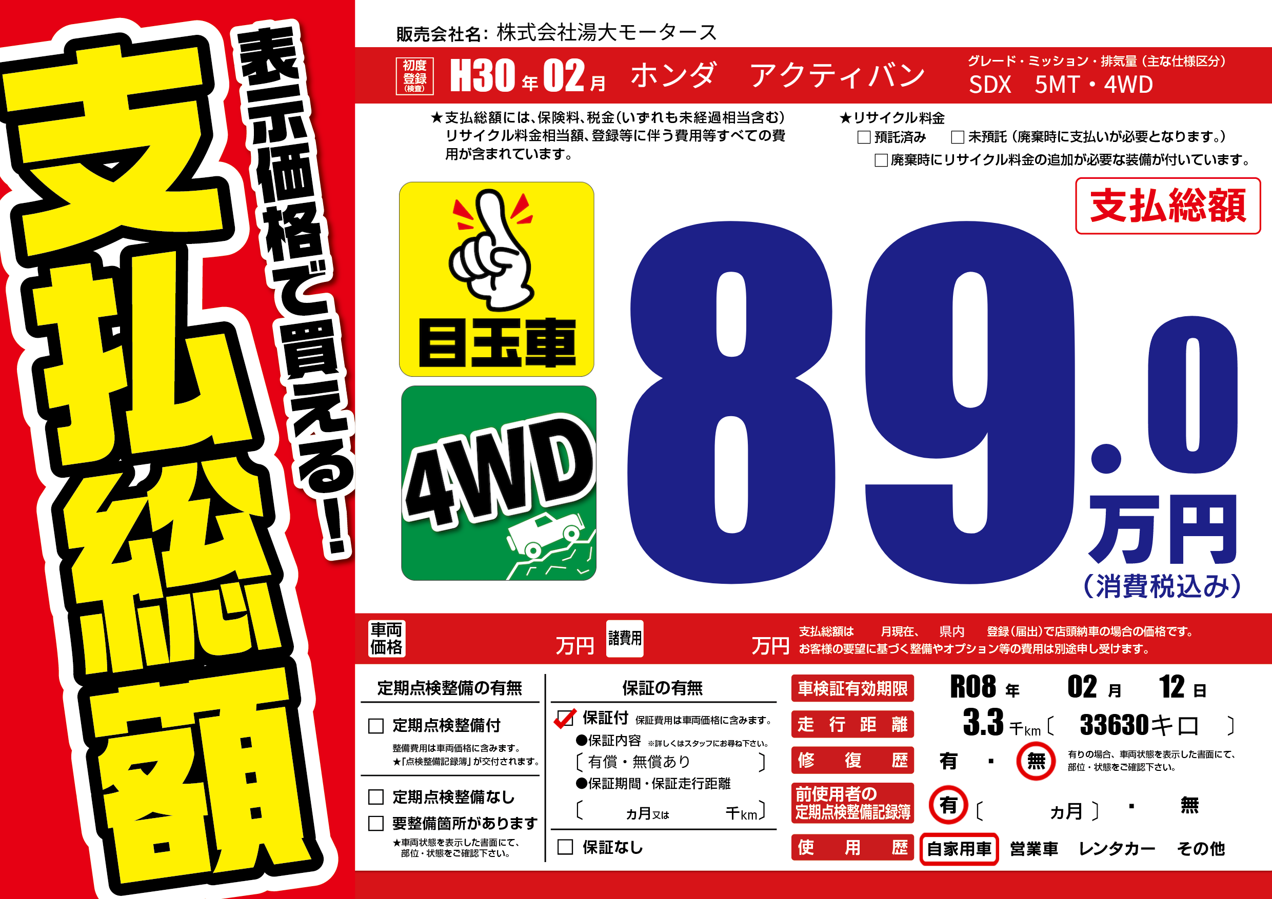 | 車名 | ホンダ アクティバン | グレード ミッション 排気量 |
