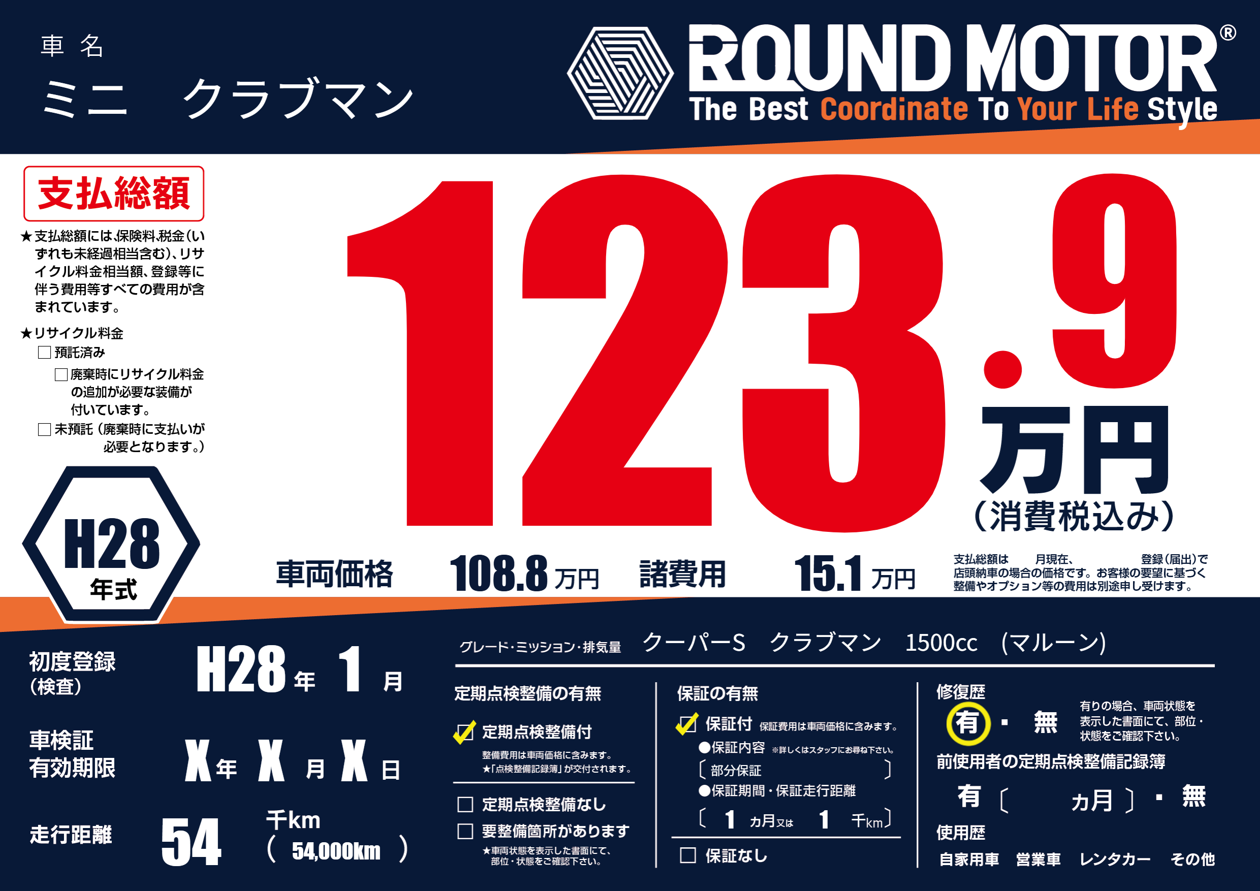 | 車名 | ミニ クラブマン | グレード ミッション 排気量 |