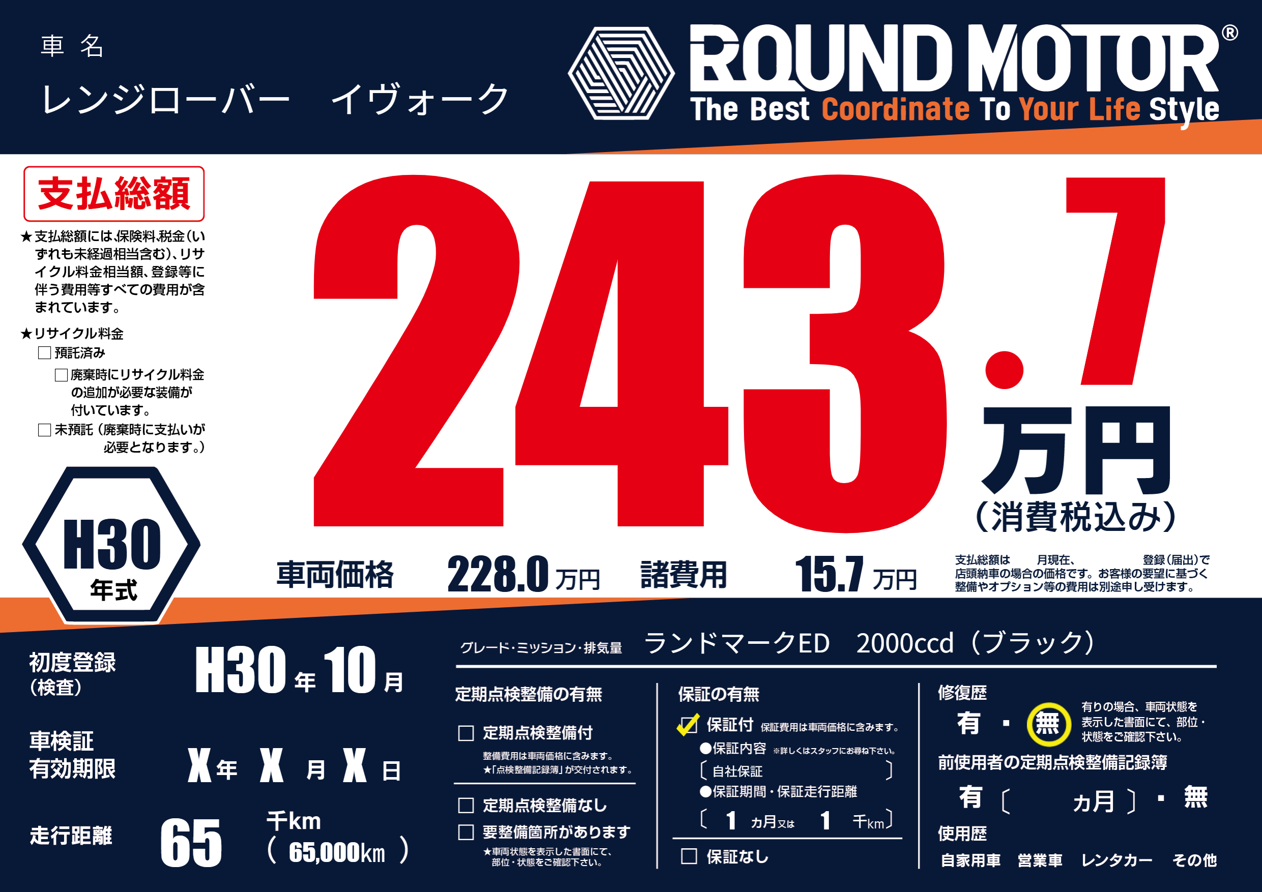 | 走行キロ | 6.5万km | 初年度登録 | H30年10月 |