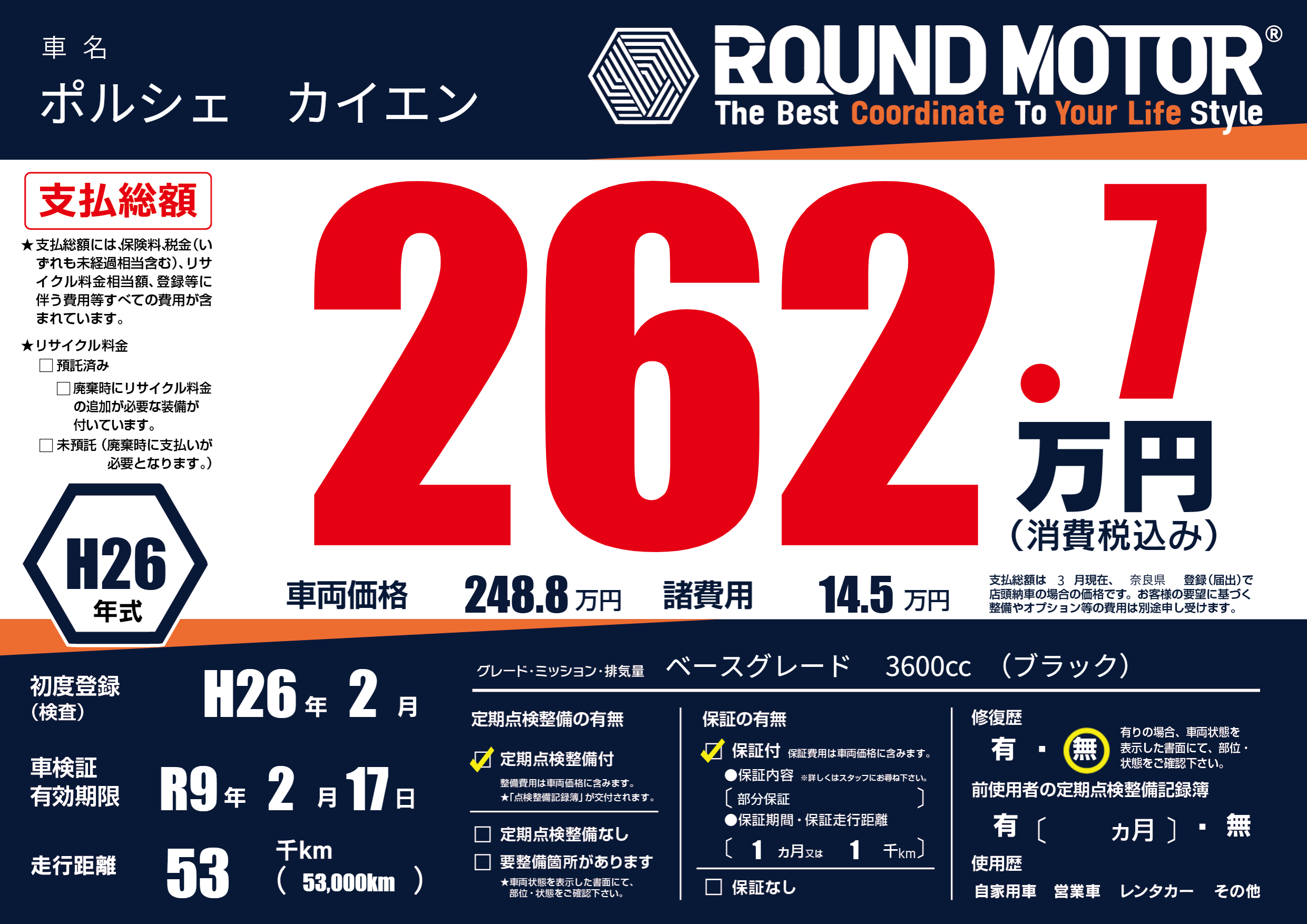 | 車名 | ポルシェ カイエン | グレード ミッション 排気量 |