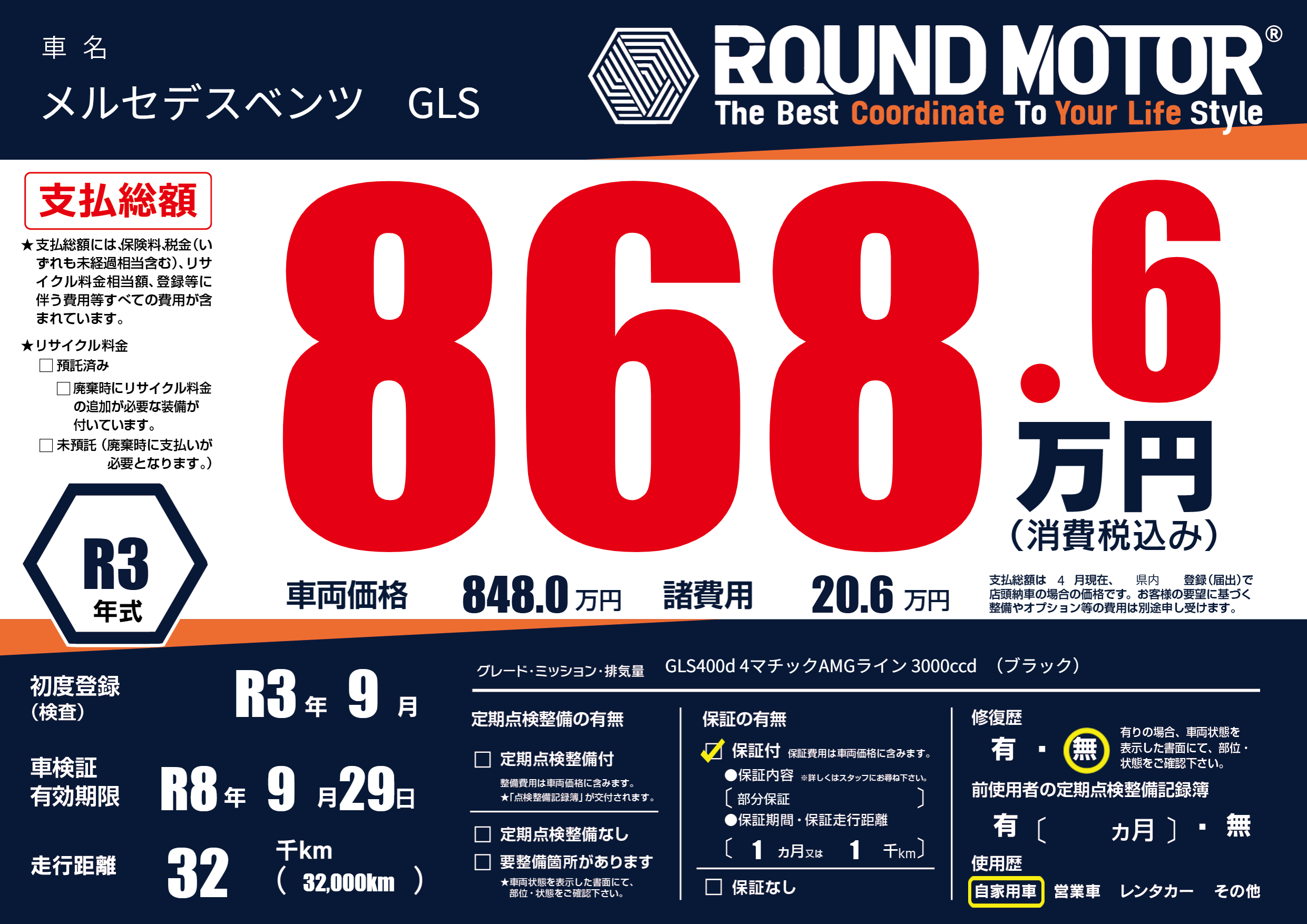 | 車名 | メルセデスベンツ GLS | グレード ミッション 排気量 |