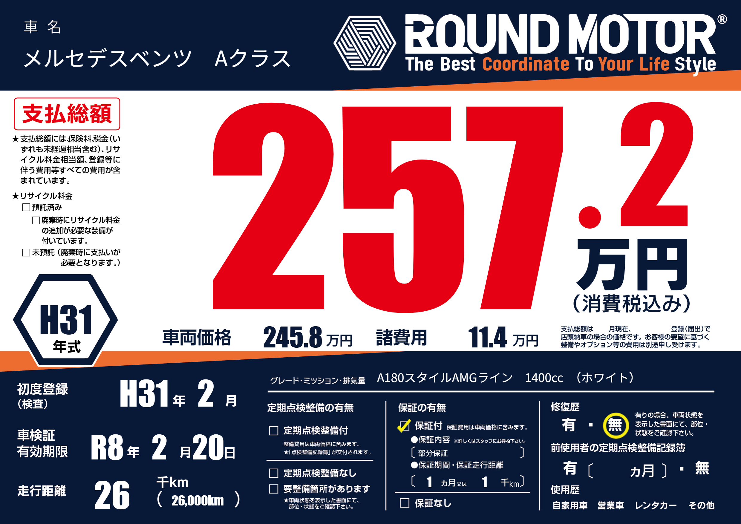 | 車名 | メルセデスベンツ Aクラス | グレード ミッション 排気量 |