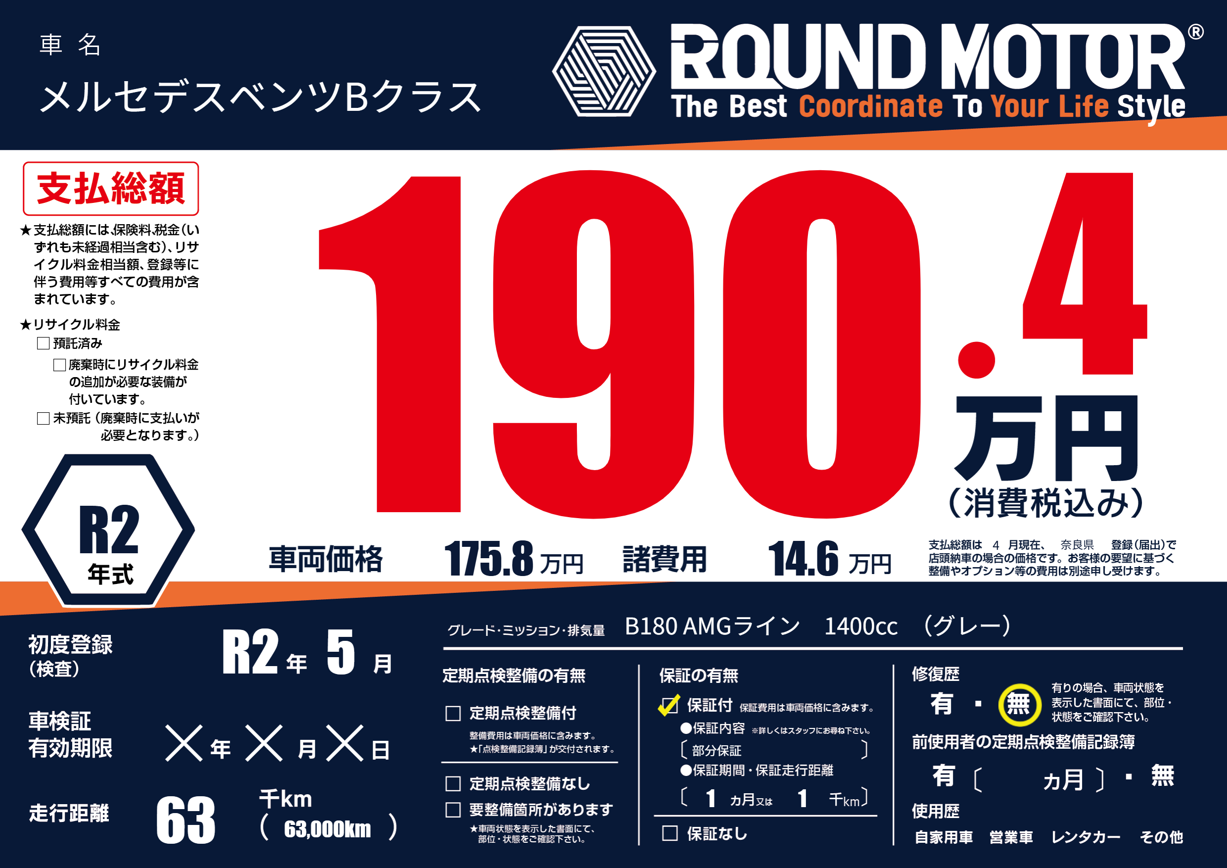 | 車名 | メルセデスベンツBクラス | グレード ミッション 排気量 |