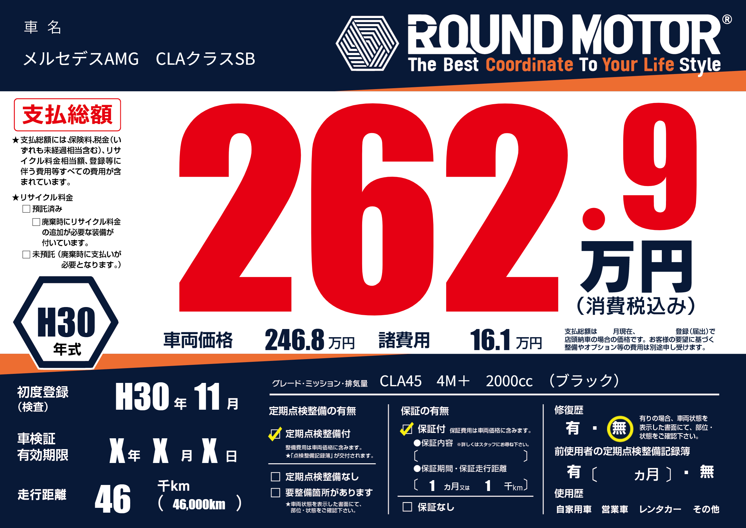 | 車名 | メルセデスAMG CLAクラスSB | グレード ミッション 排気量 |