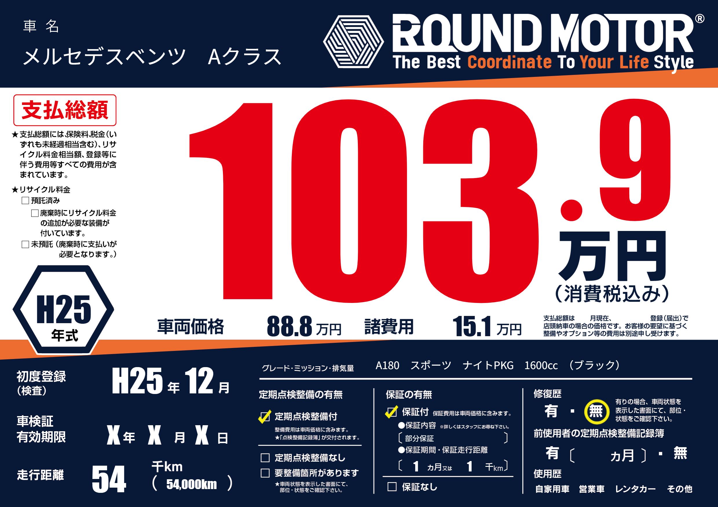 | 車名 | メルセデスベンツ Aクラス | グレード ミッション 排気量 |