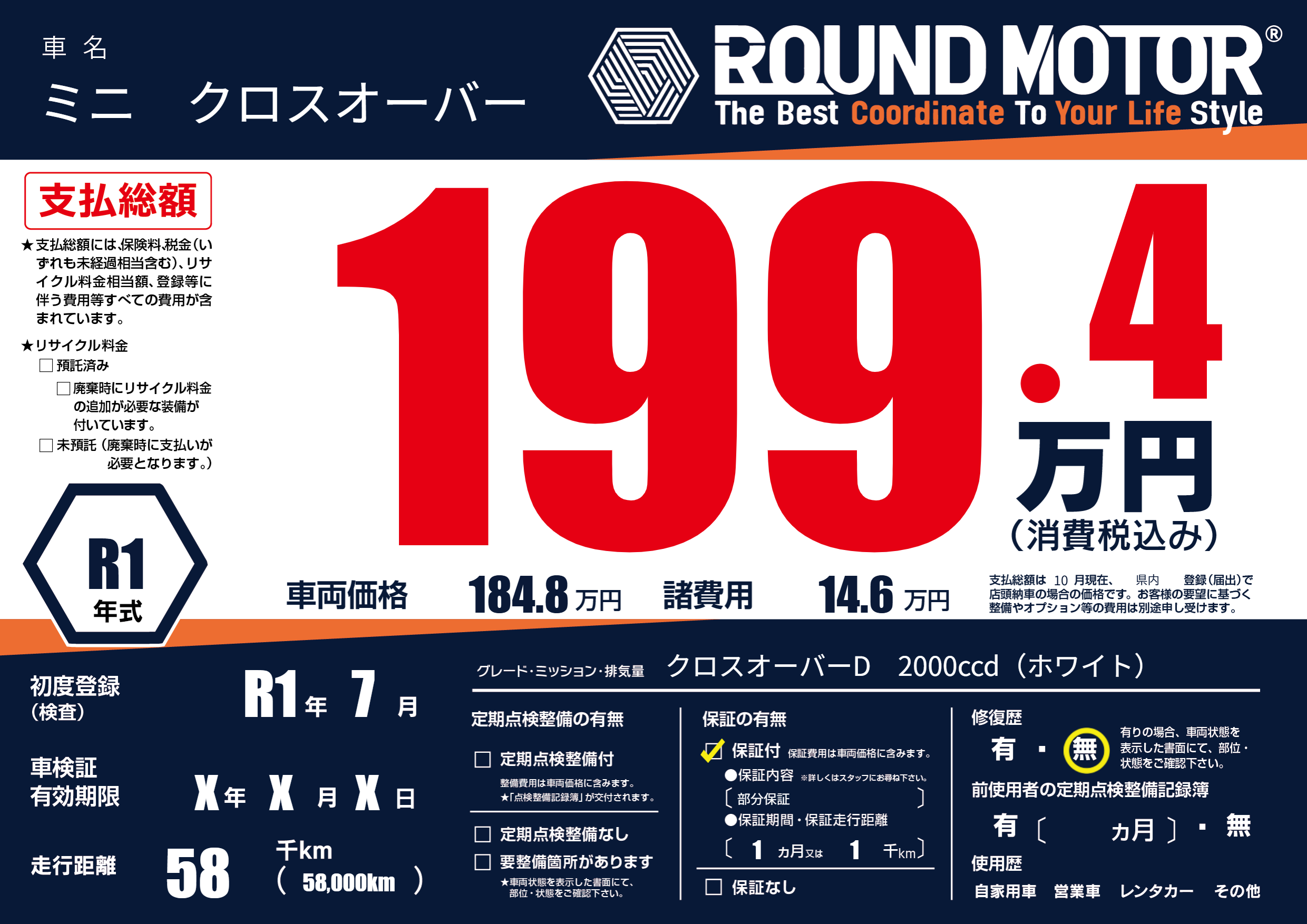 | 車名 | ミニ クロスオーバー | グレード ミッション 排気量 |