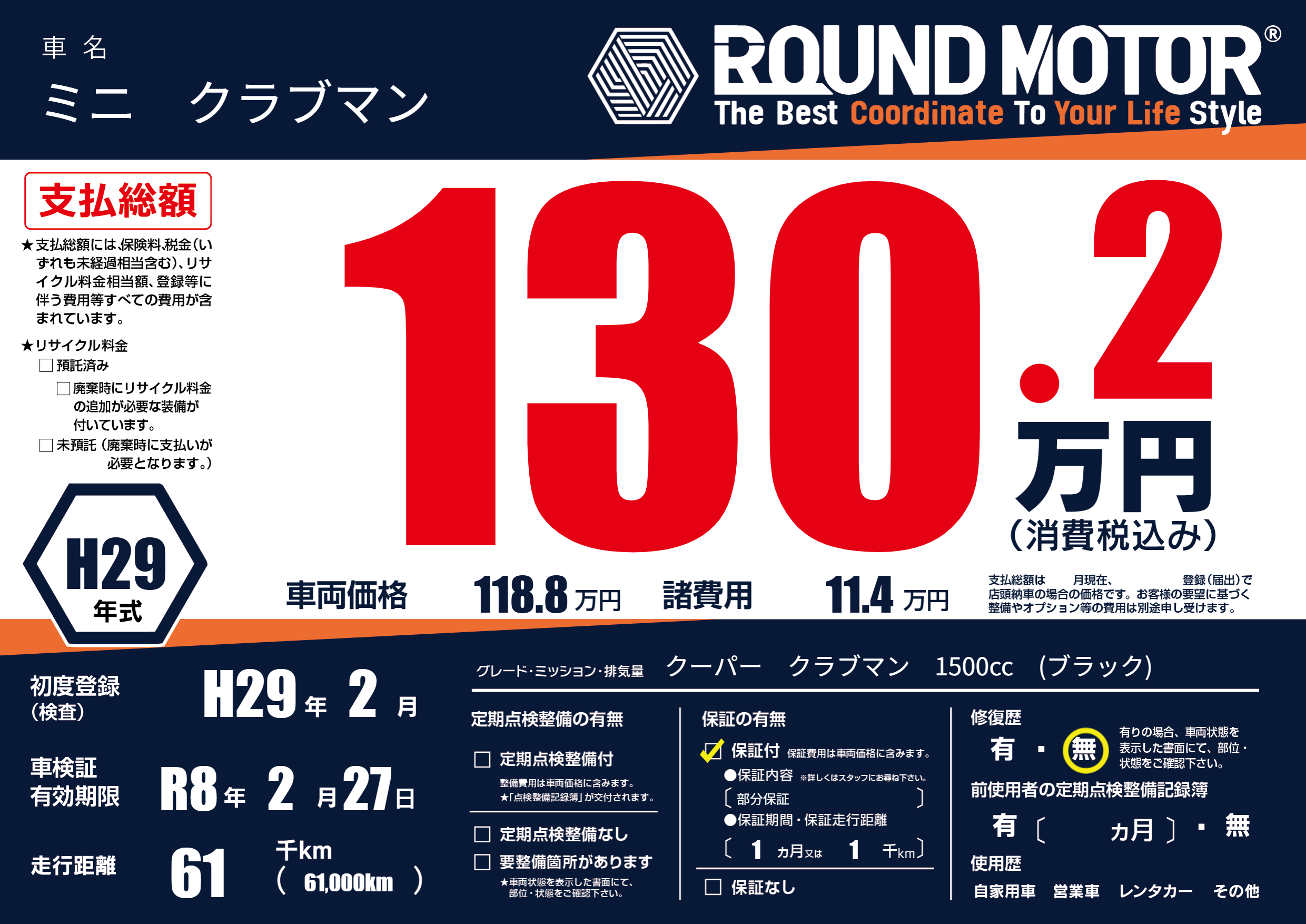 | 車名 | ミニ クラブマン | グレード ミッション 排気量 |