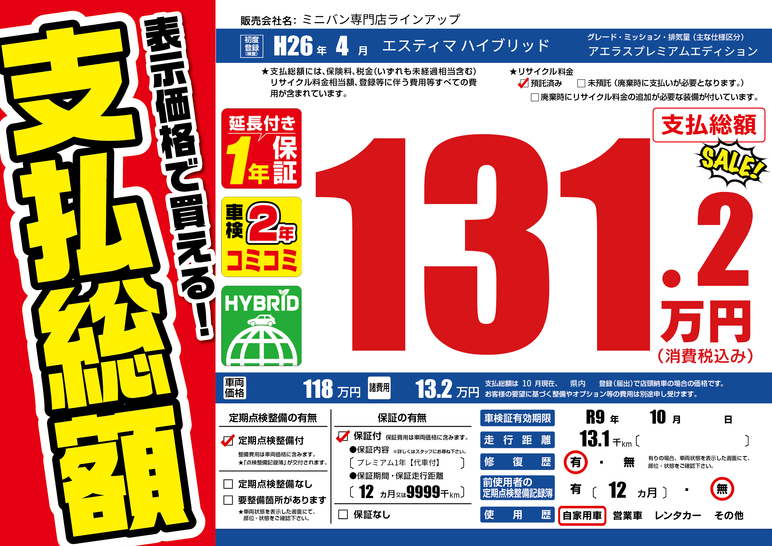 | 車名 | エスティマ ハイブリッド | グレード ミッション 排気量 |