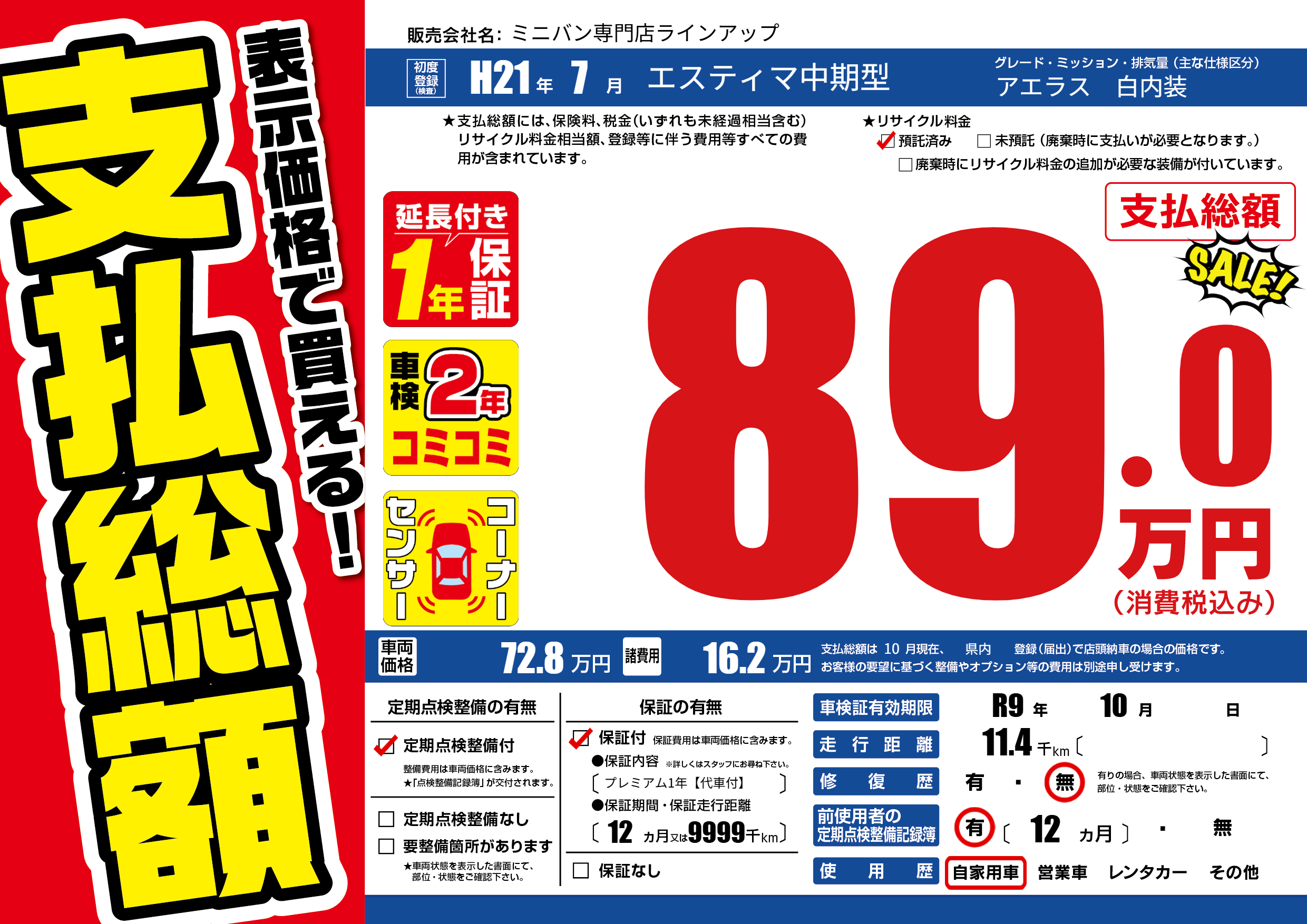 | 車検制限 | R9年 10月 - 日 | ||