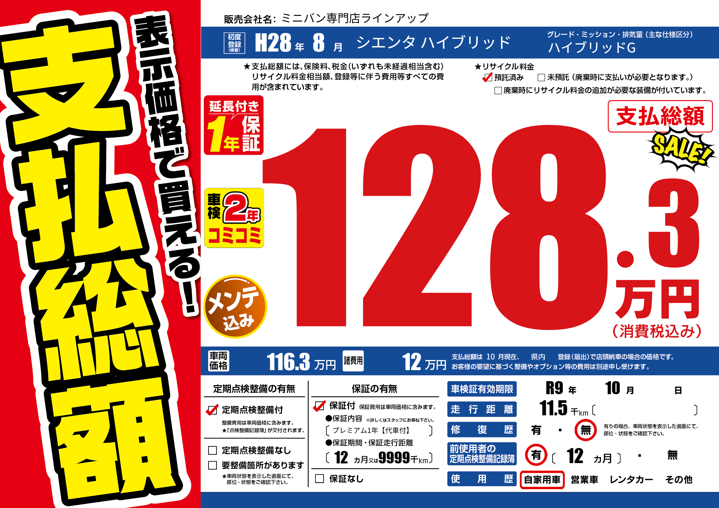 | 車名 | シエンタ ハイブリッド | グレード ミッション 排気量 |