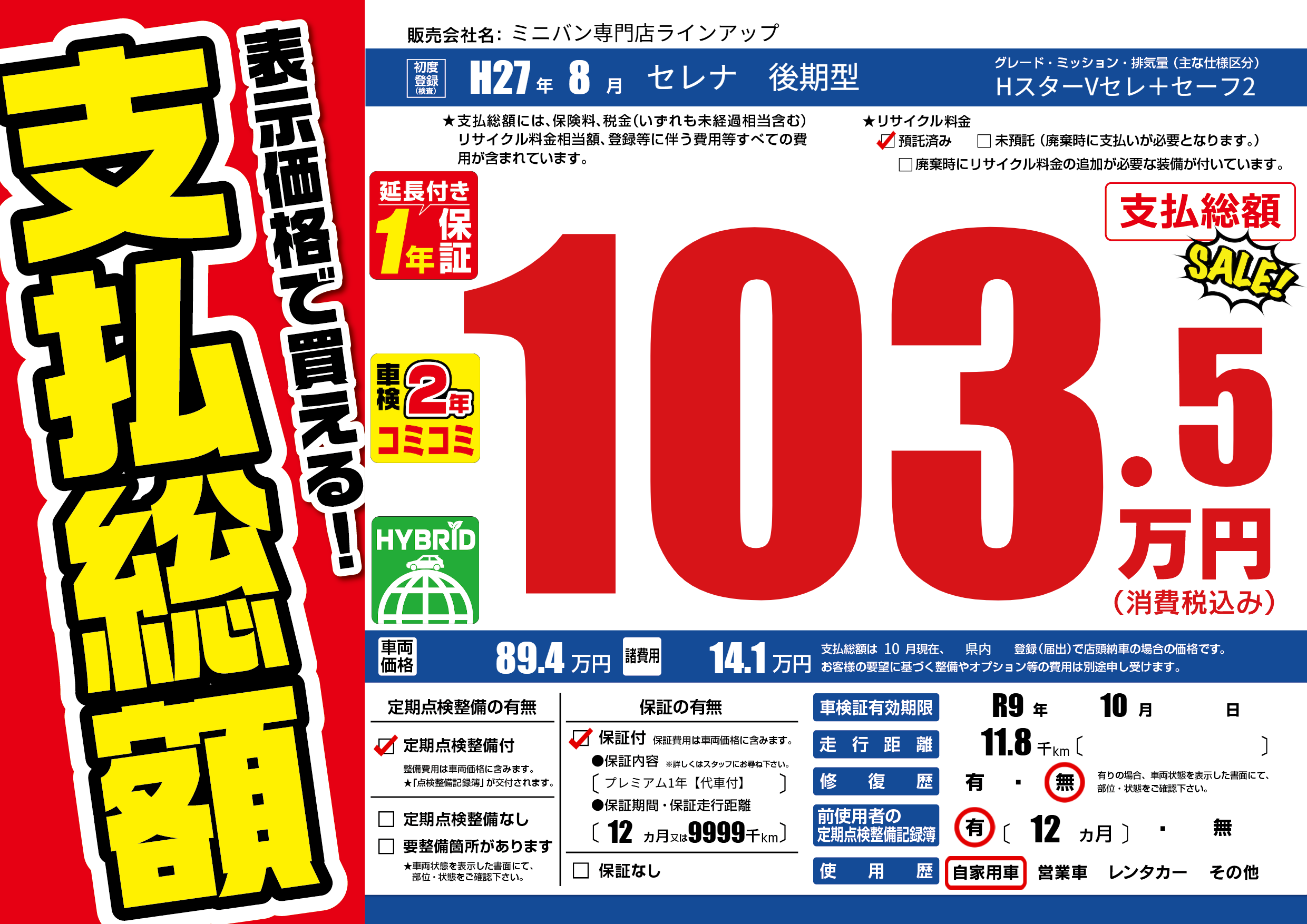 | 車名 | セレナ 後期型 | グレード ミッション 排気量 |