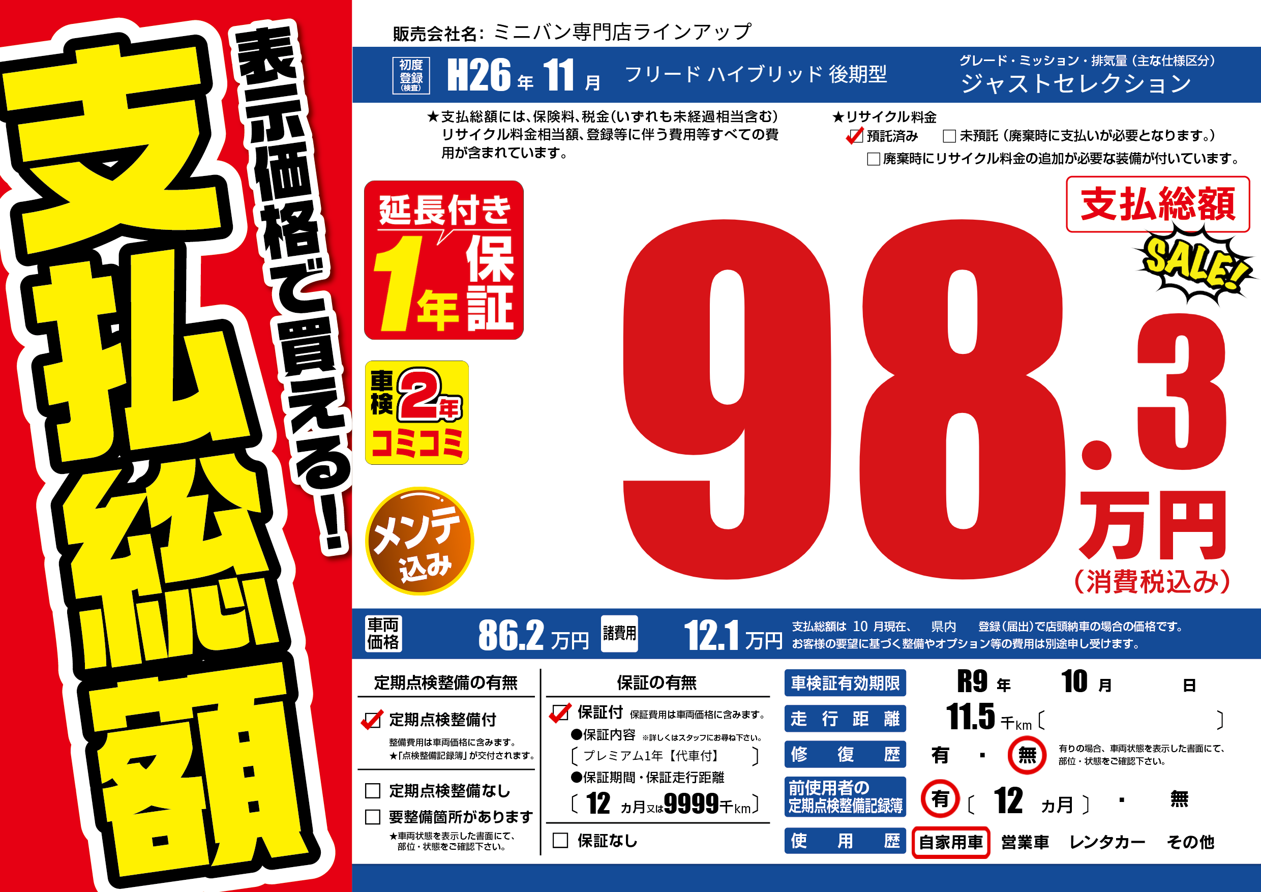 | 車検制限 | R9年 10月 - 日 | ||