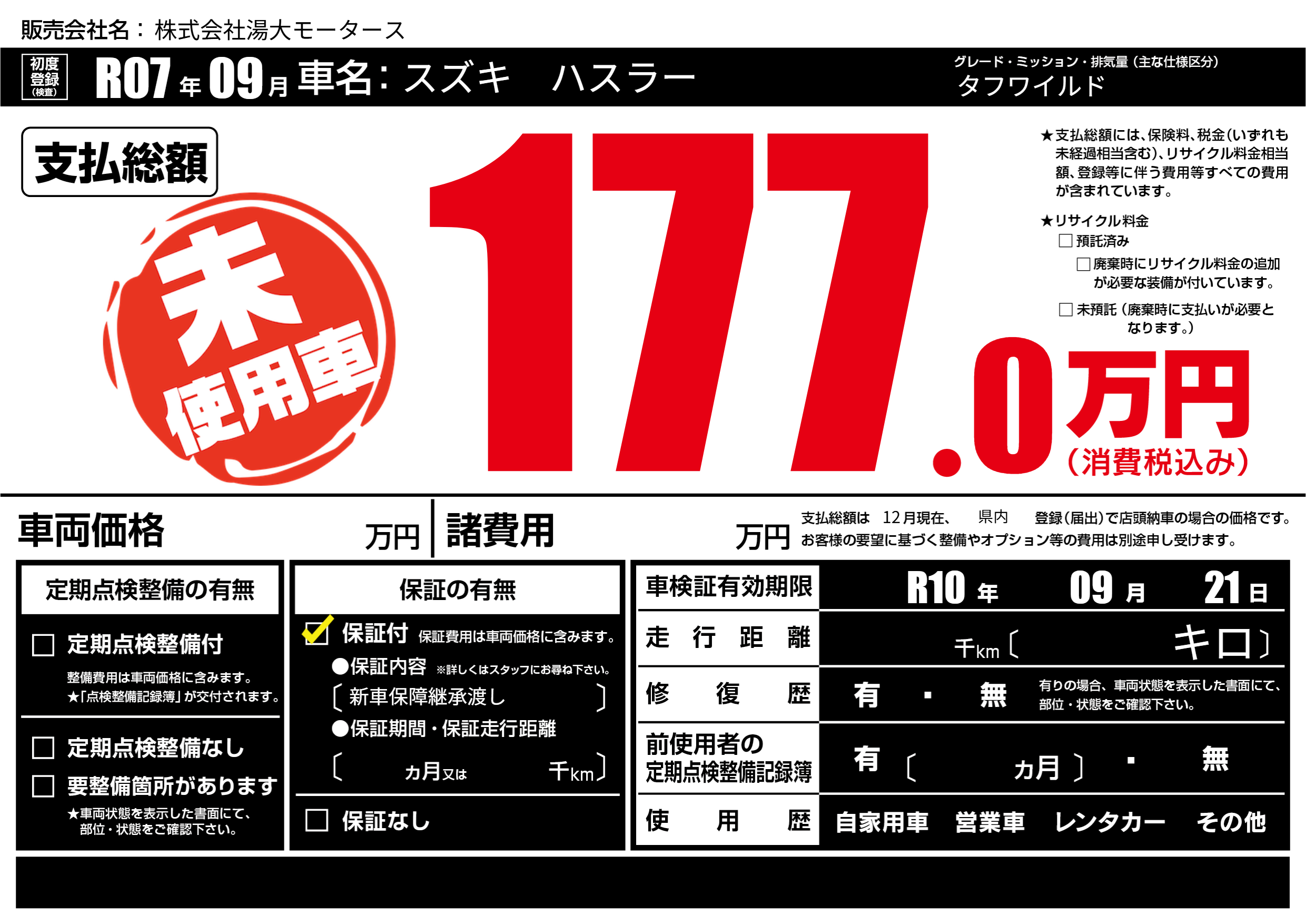 保証付き 保証内容(新車保障継承渡し) ---ヶ月または()千kmまで |