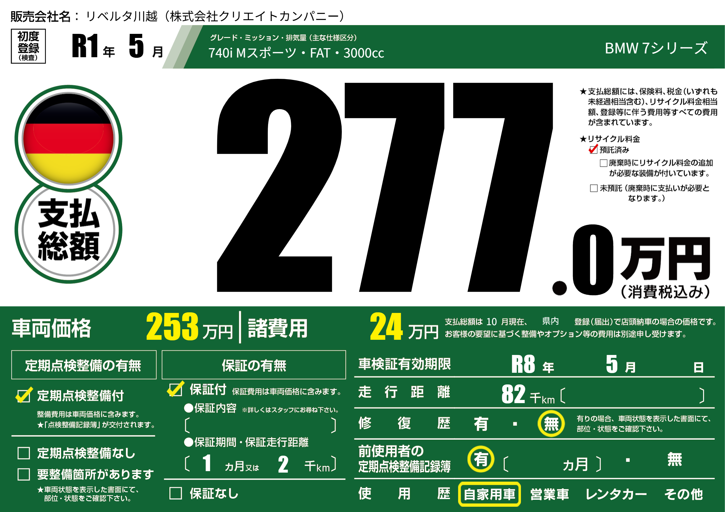 | 車名 | BMW 7シリーズ | グレード ミッション 排気量 |
