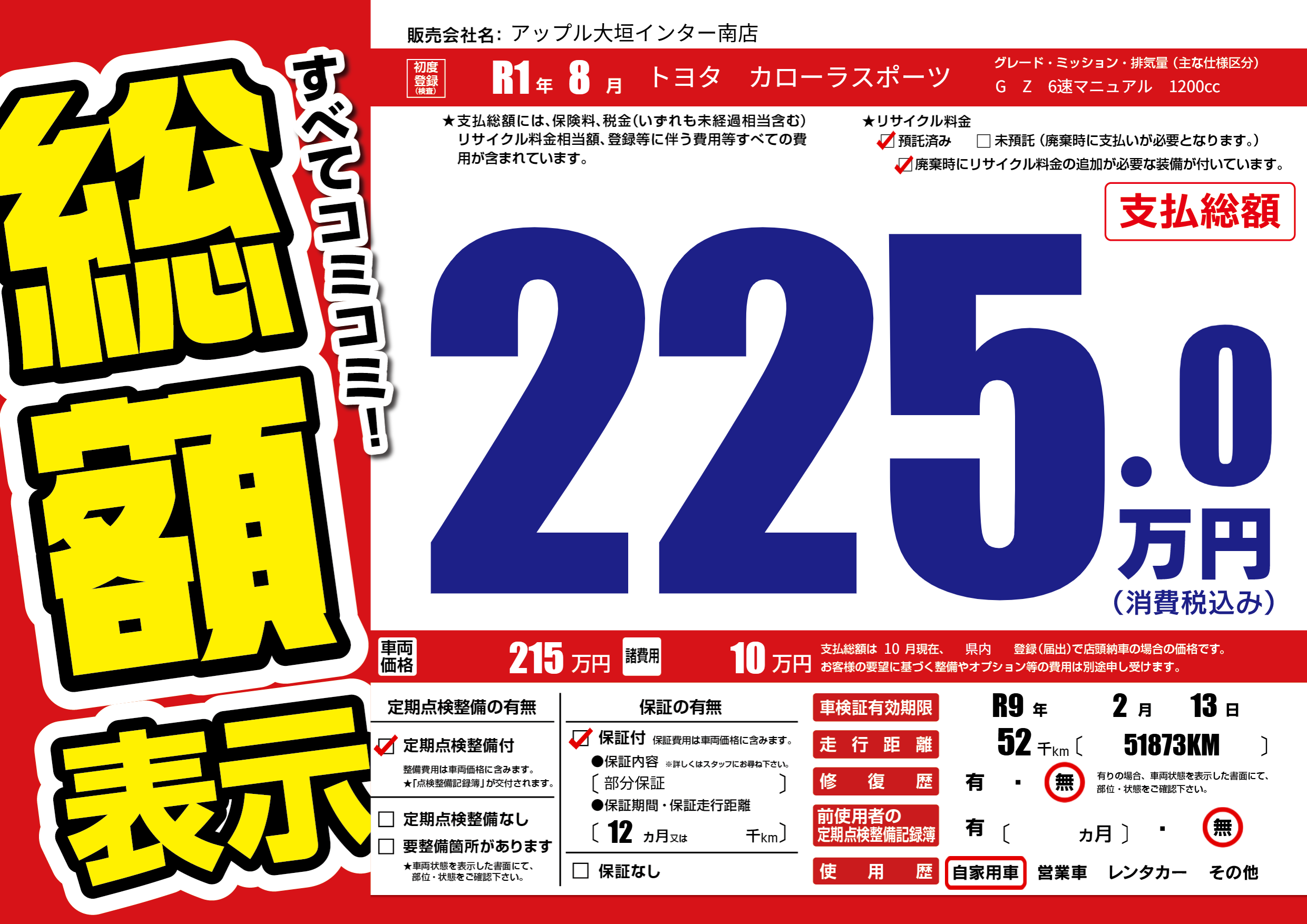 | 車名 | トヨタ カローラスポーツ | グレード ミッション 排気量 |