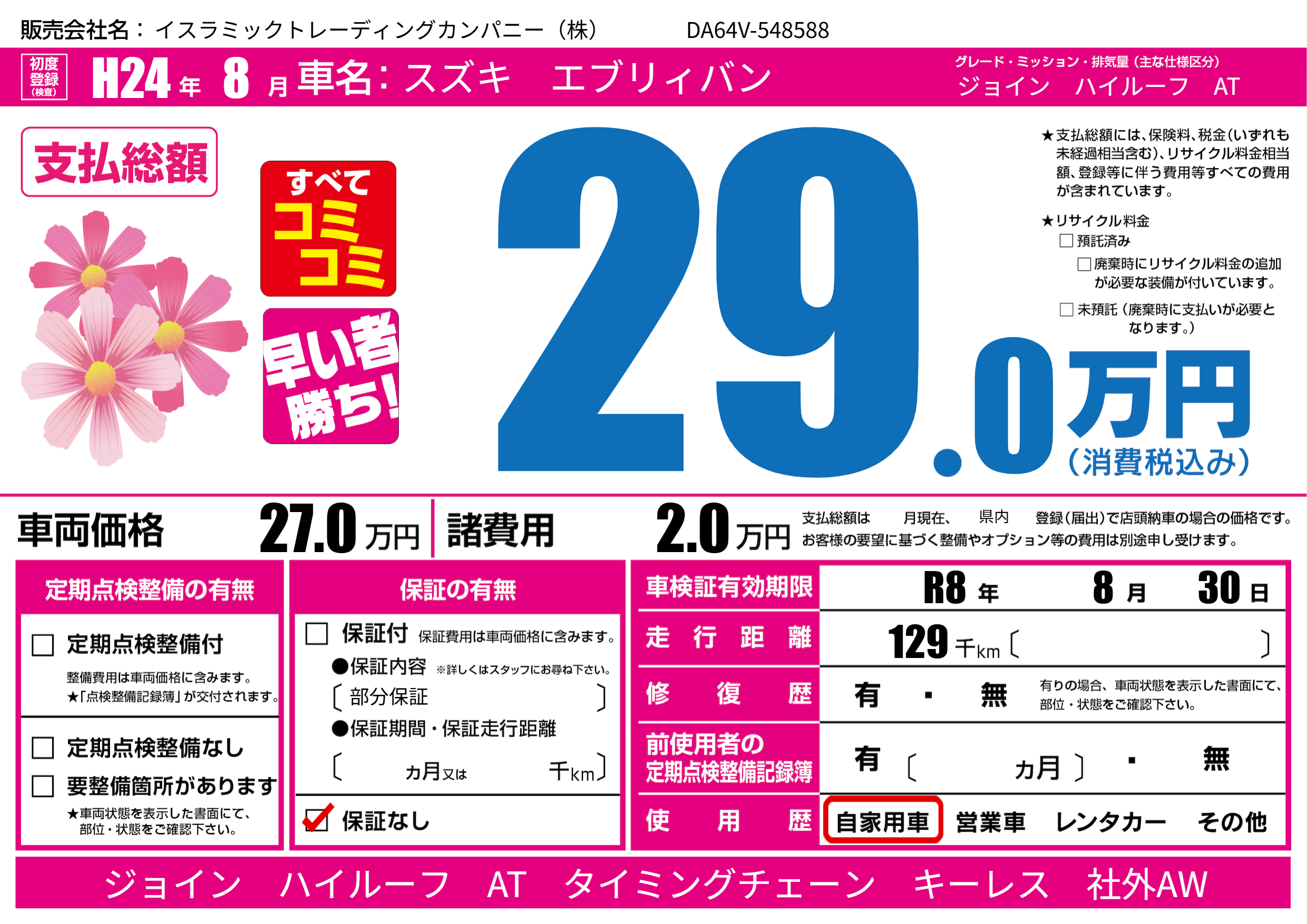 | 走行キロ | 12.9万km | 初年度登録 | H24年8月 |