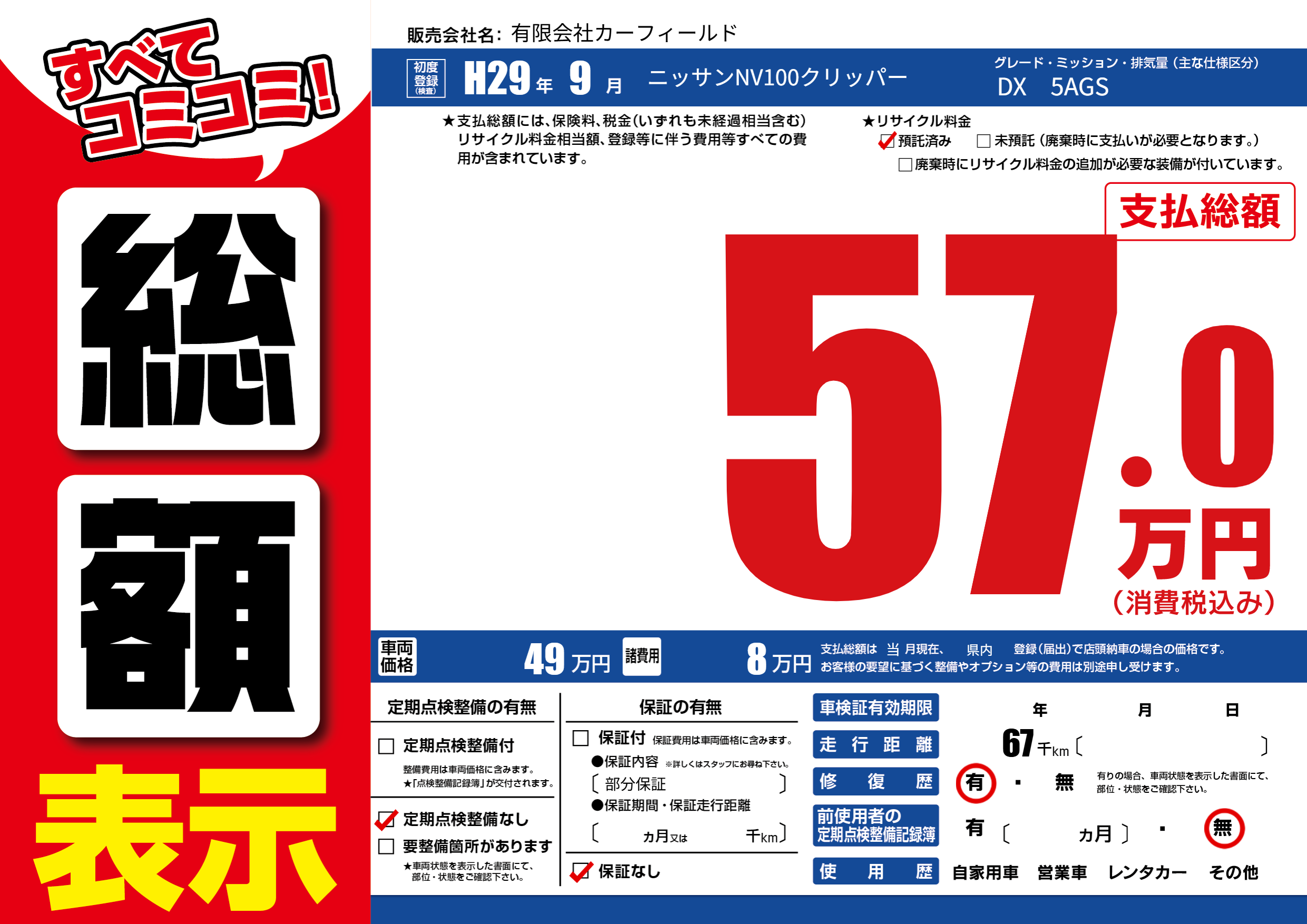 保証なし 保証内容(部分保証) ---ヶ月または()千kmまで |