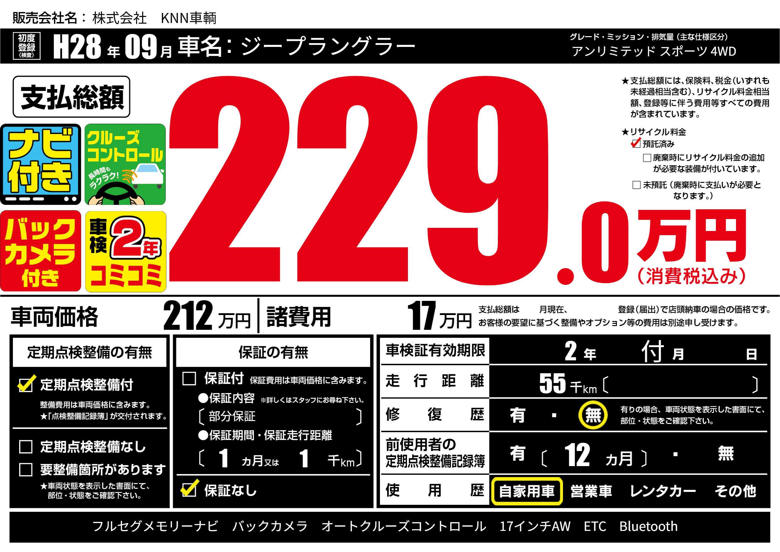| 走行キロ | 5.5万km | 初年度登録 | H28年09月 |