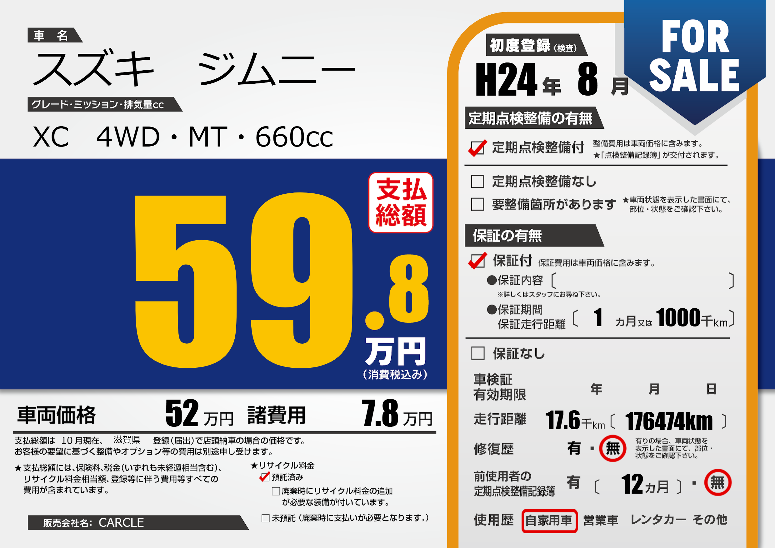 | 車名 | スズキ ジムニー | グレード ミッション 排気量 |