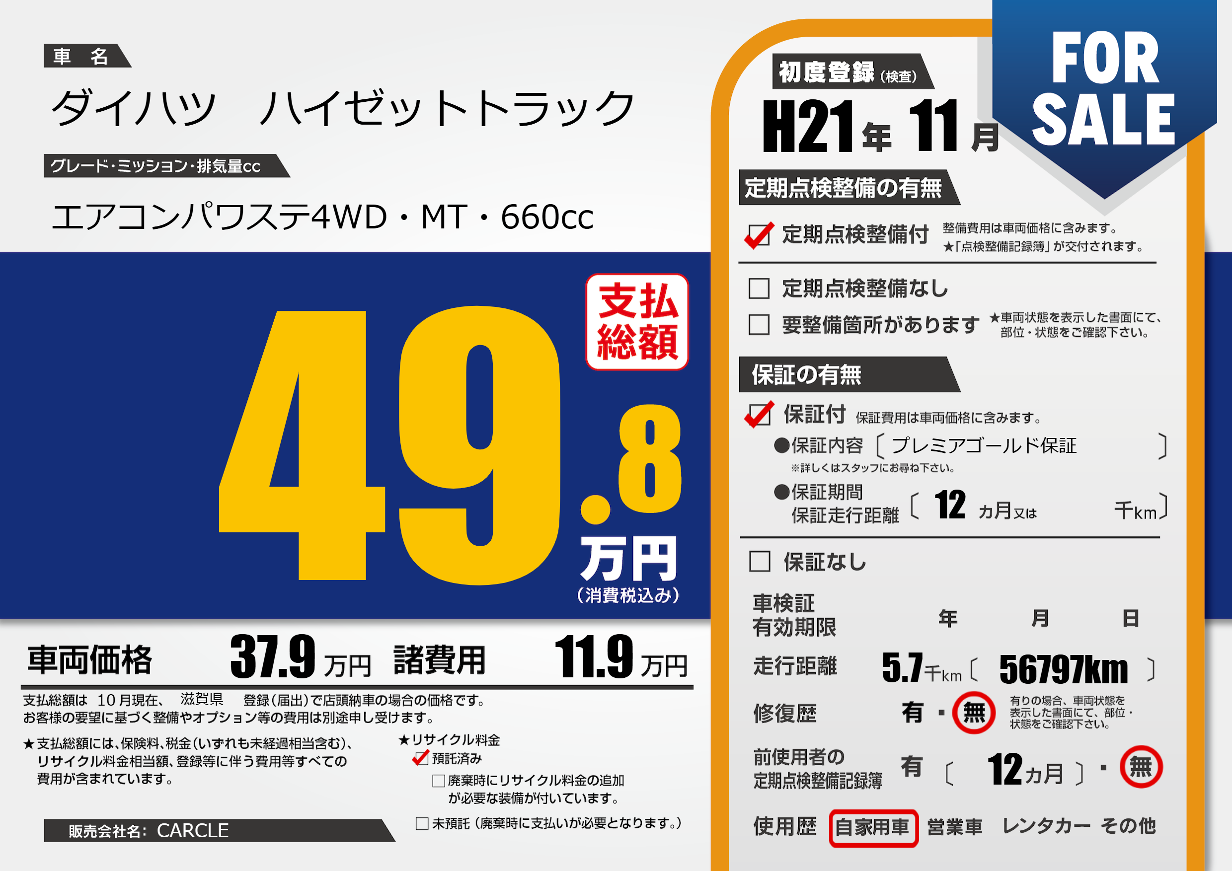 | 走行キロ | 0.5万km | 初年度登録 | H21年11月 |