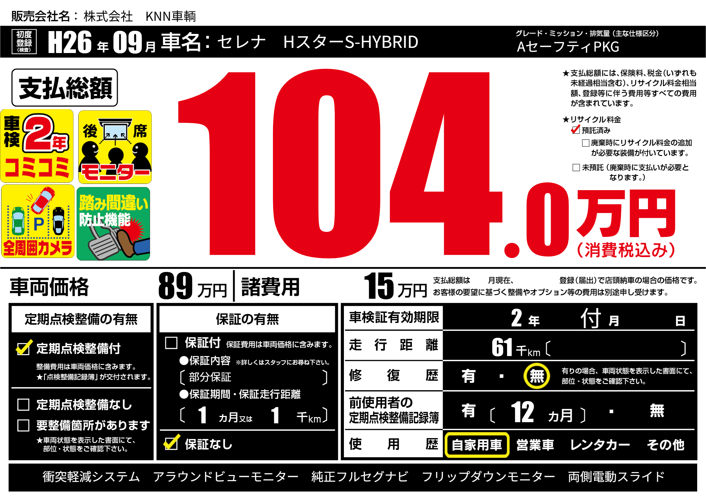 | 車名 | セレナ HスターS-HYBRID | グレード ミッション 排気量 |