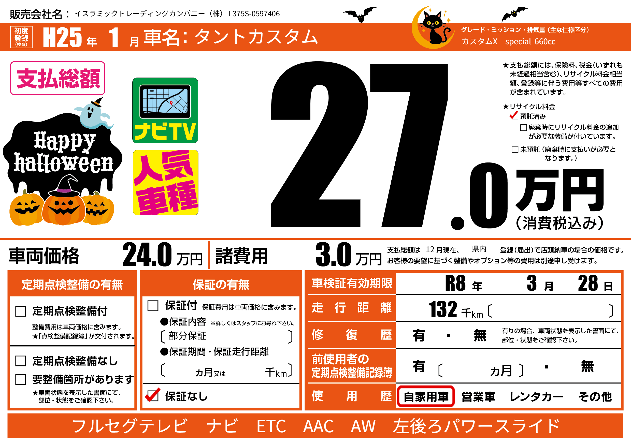 | 走行キロ | 13.2万km | 初年度登録 | H25年1月 |