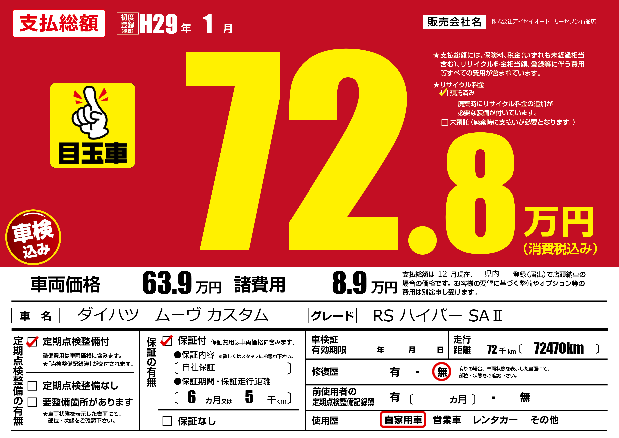 保証付き 保証内容(自社保証) 6ヶ月または5千km |