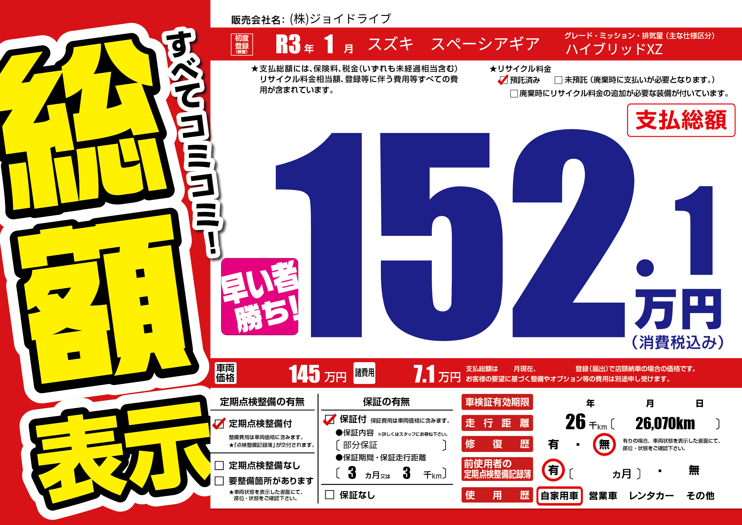 | 走行キロ | 2.6万km | 初年度登録 | R3年1月 |