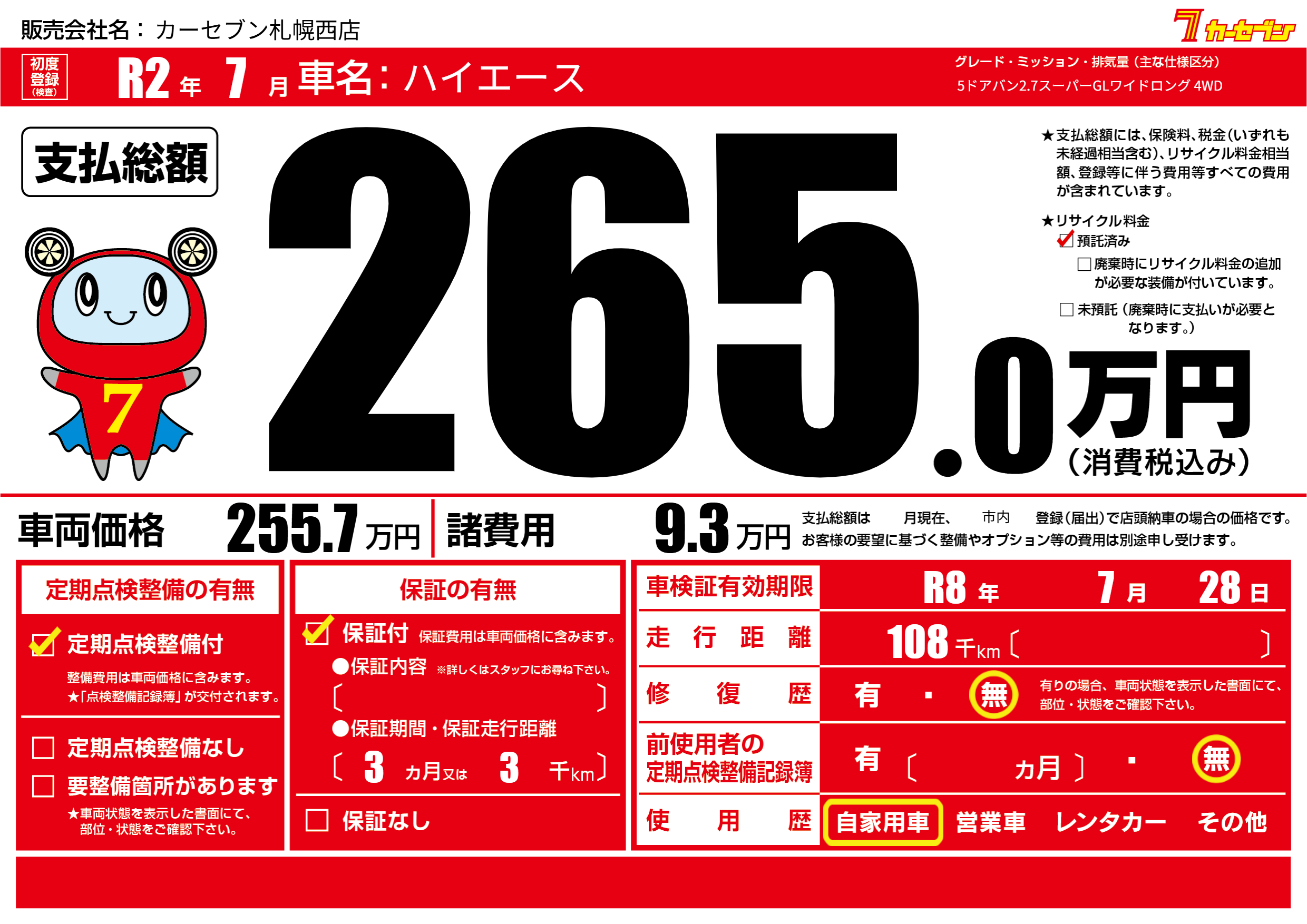 | 走行キロ | 10.8万km | 初年度登録 | R2年7月 |