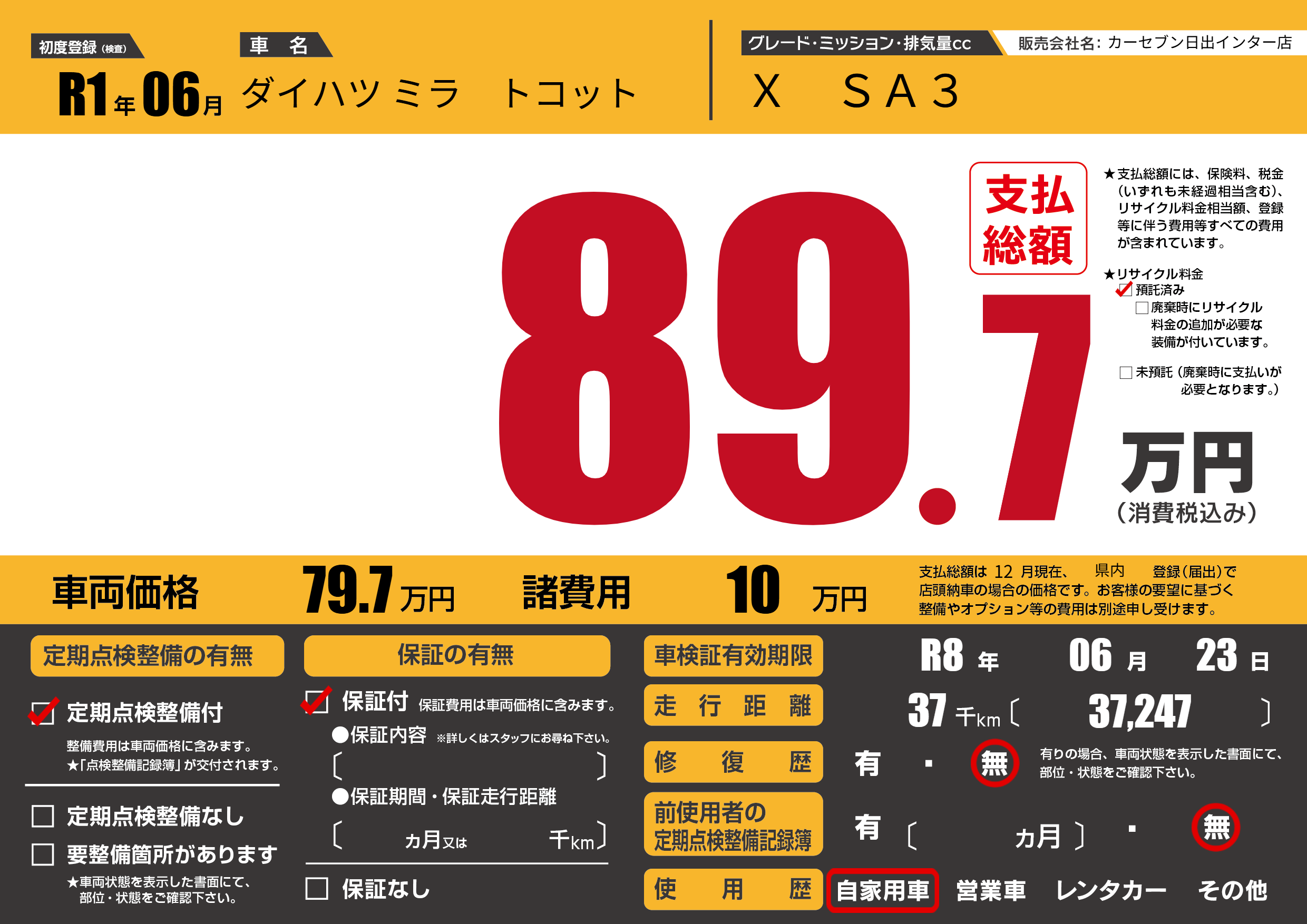 | 走行キロ | 3.7万km | 初年度登録 | R1年06月 |
