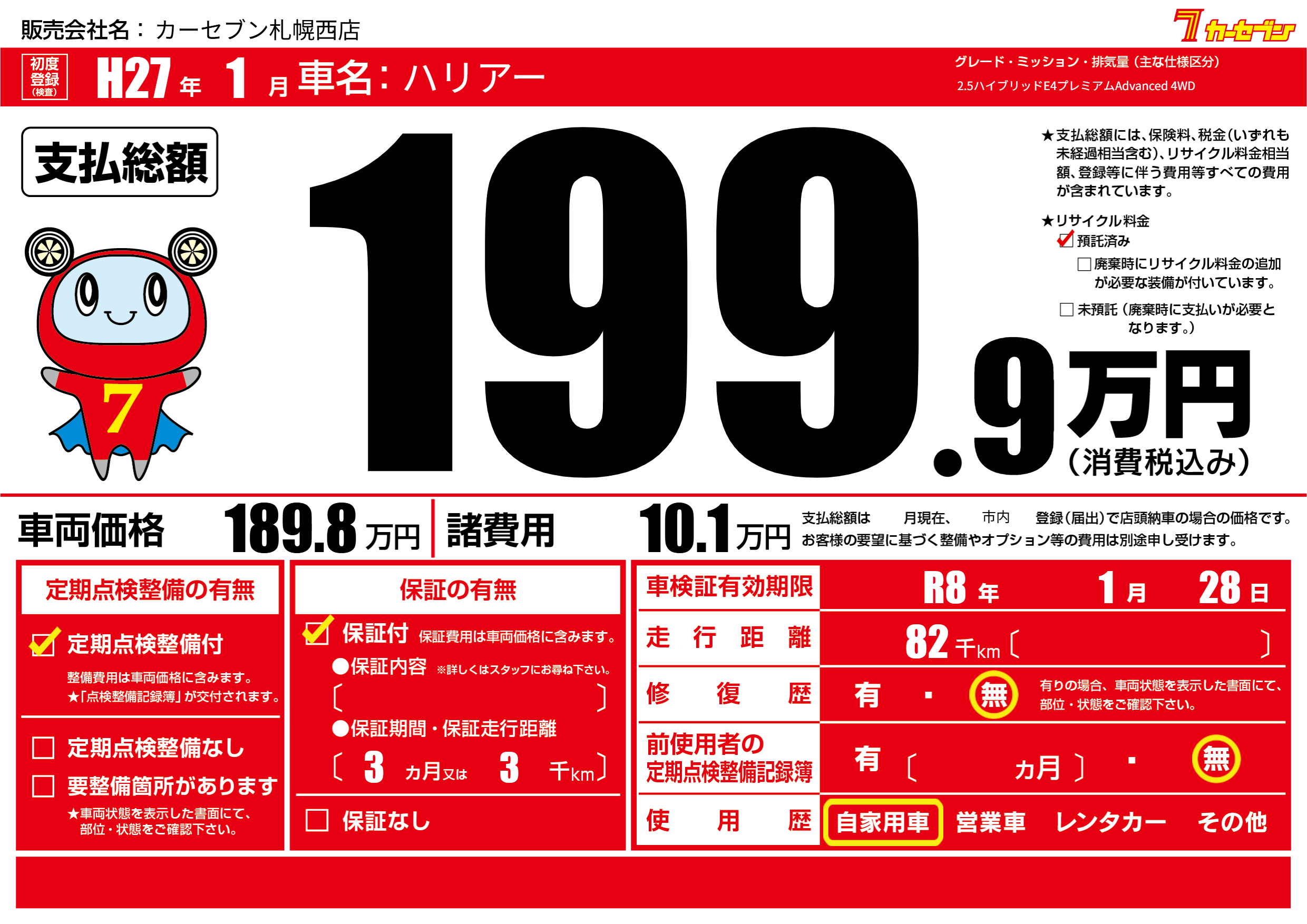 | 走行キロ | 8.2万km | 初年度登録 | H27年1月 |