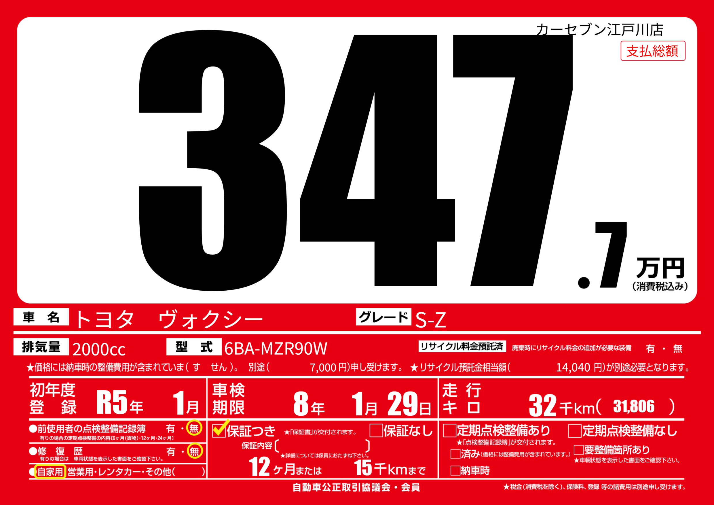 保証付き 保証内容(---) 12ヶ月または(15)千kmまで |
