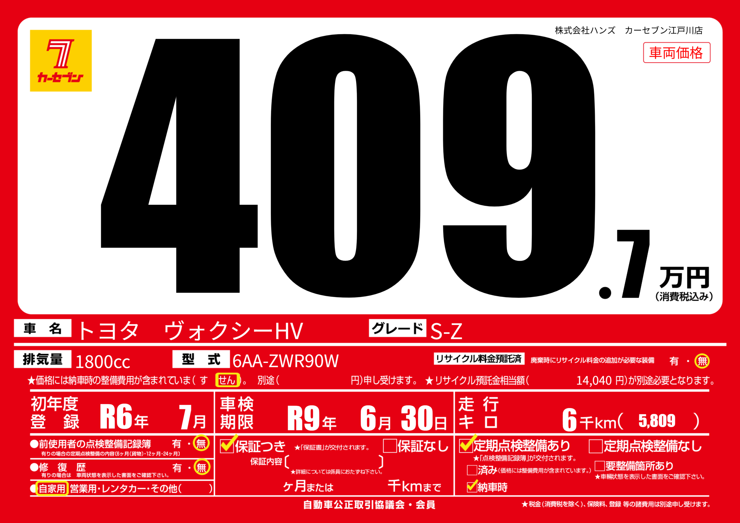 | 車検制限 | R9年 6月 30日 | ||