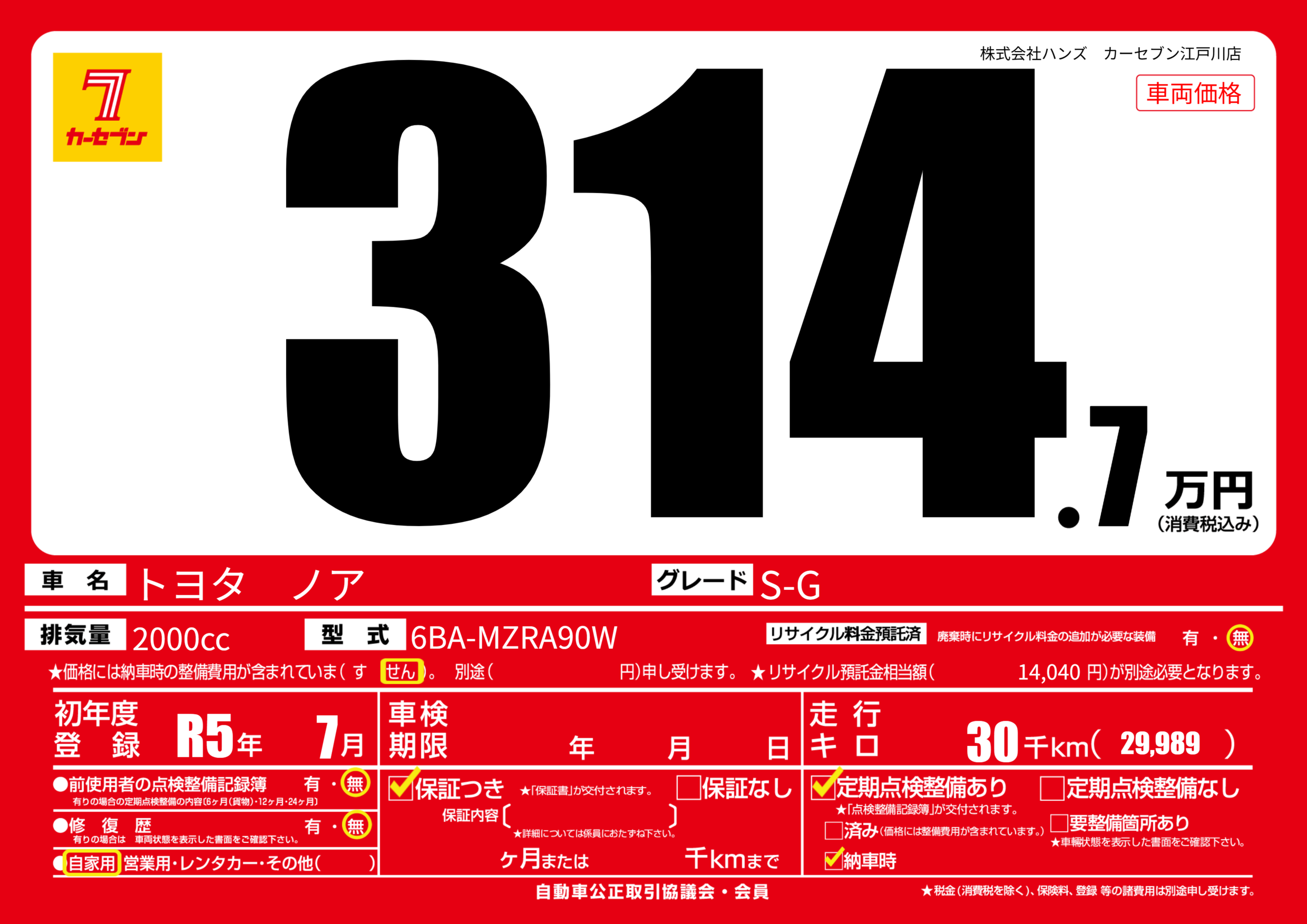| 走行キロ | 3万km | 初年度登録 | R5年7月 |