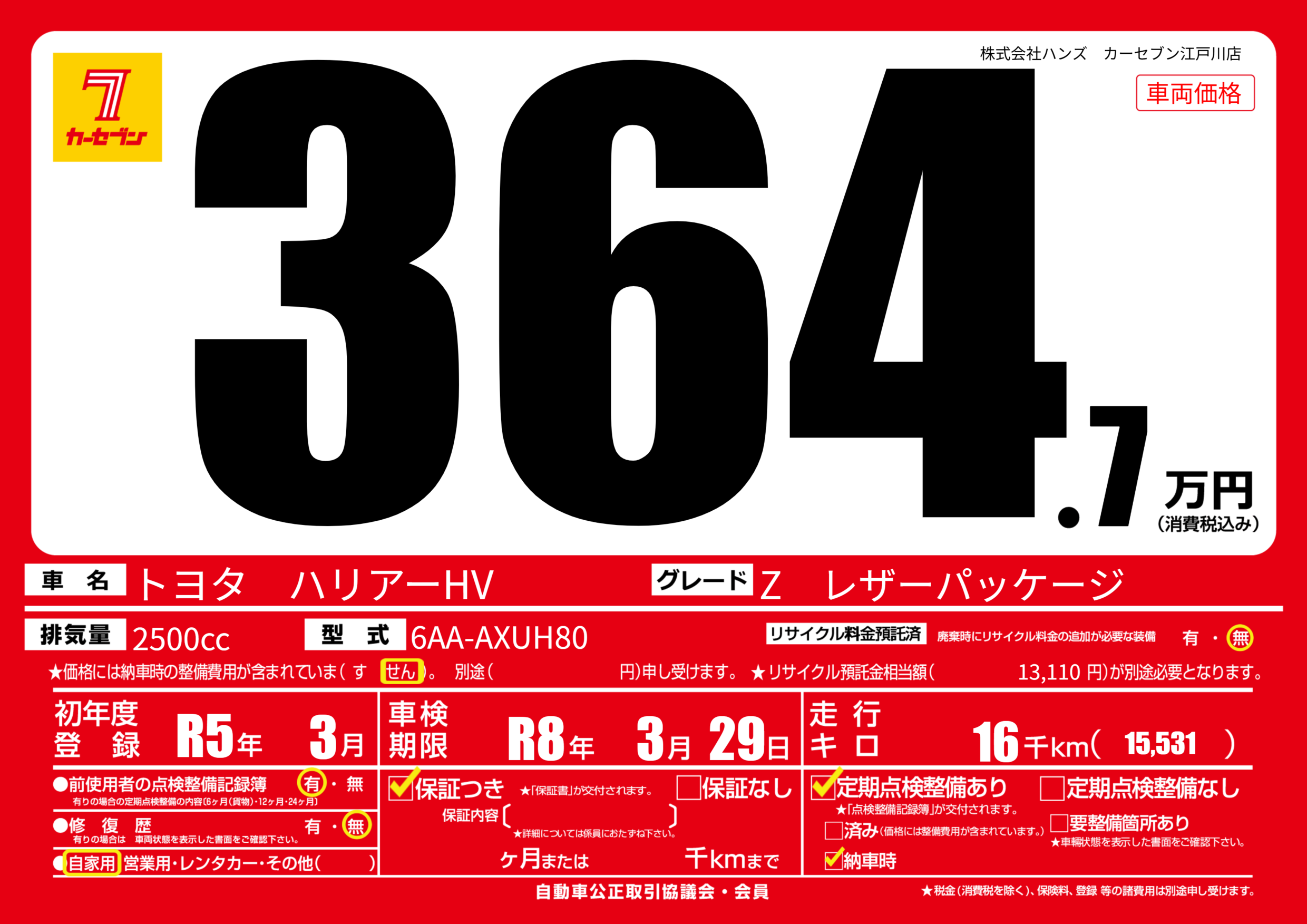 | 車名 | トヨタ ハリアーHV | グレード ミッション 排気量 |