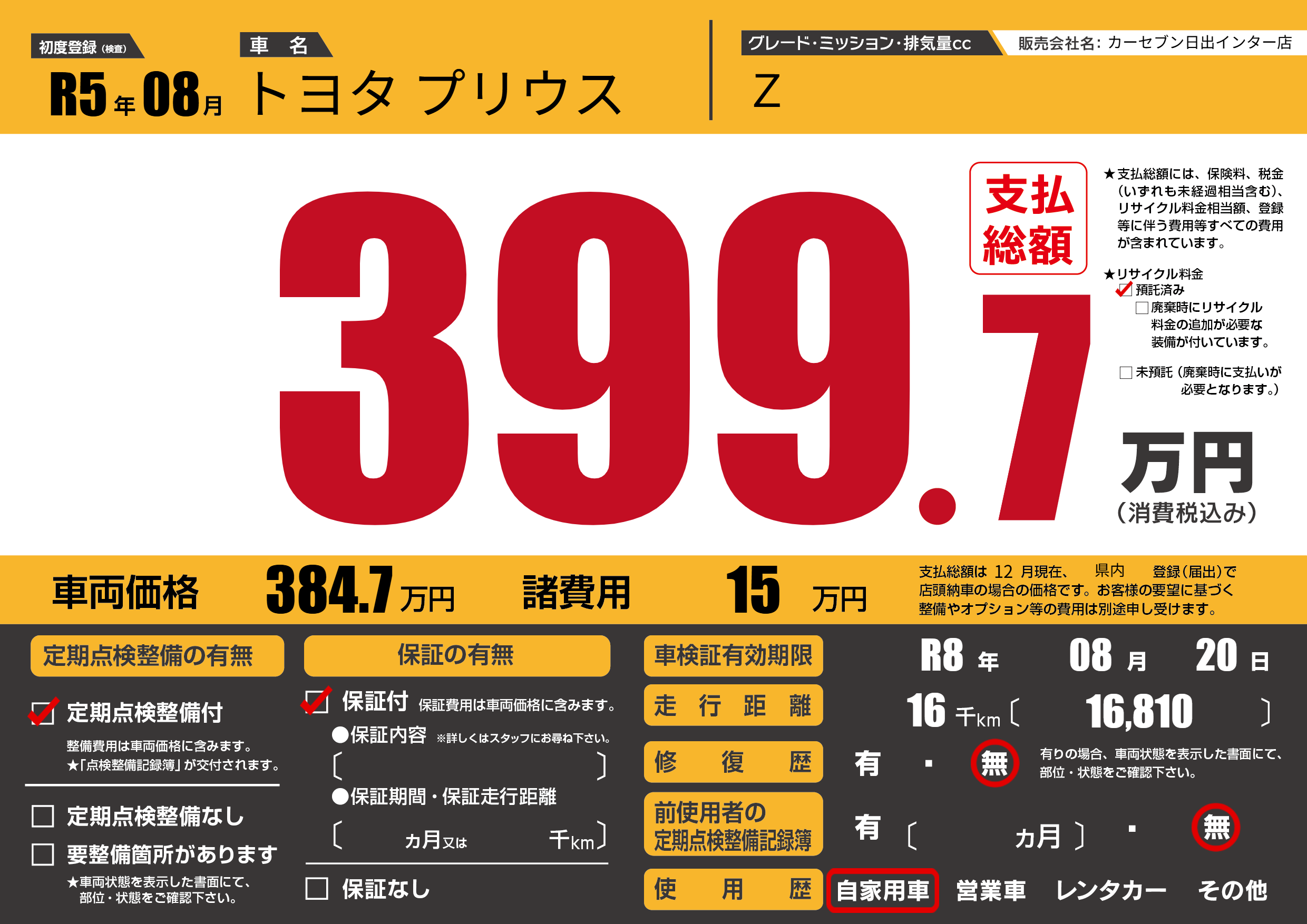 | 車名 | トヨタ プリウス | グレード ミッション 排気量 |