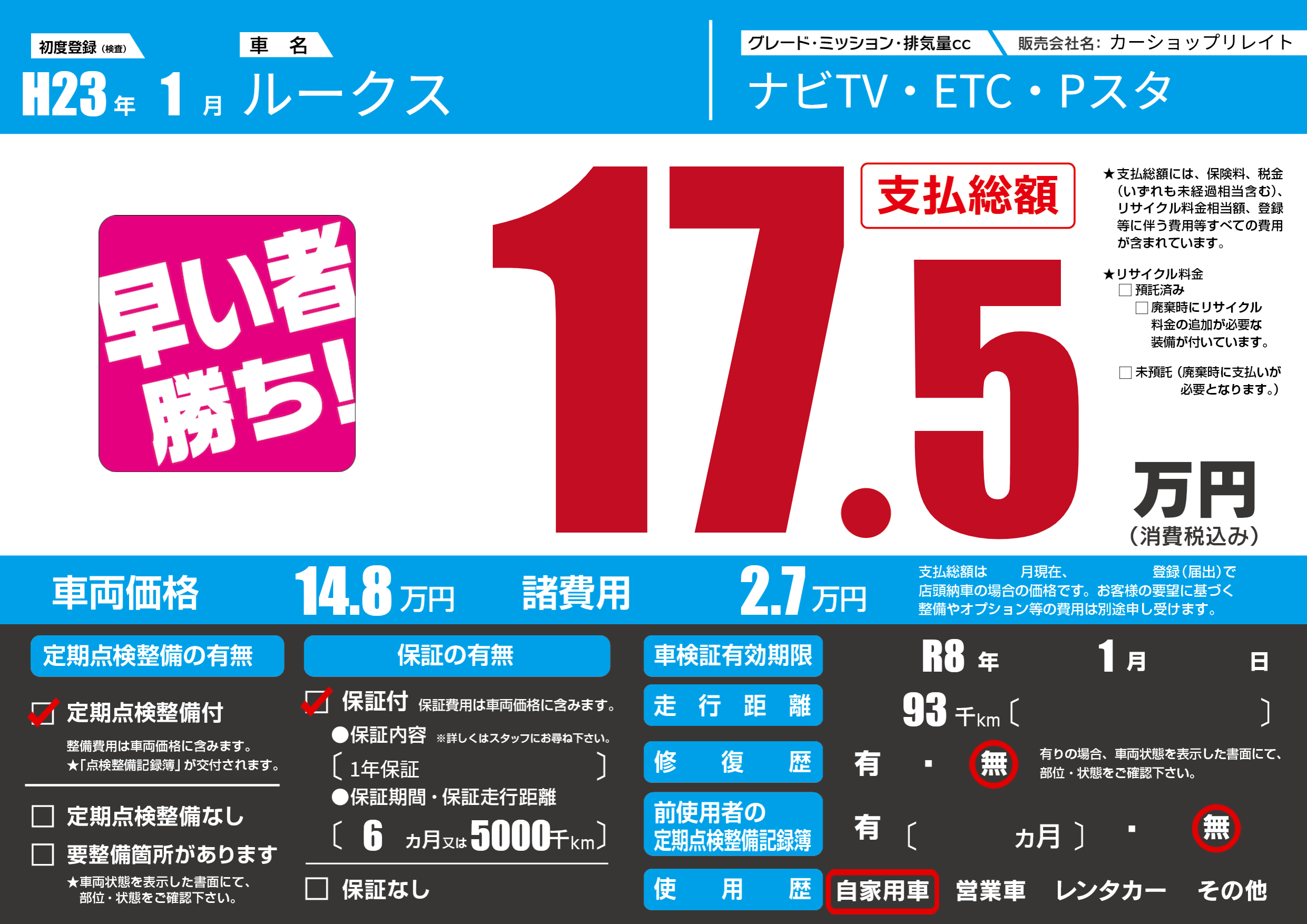 | 車検制限 | R8年 1月 - 日 | ||