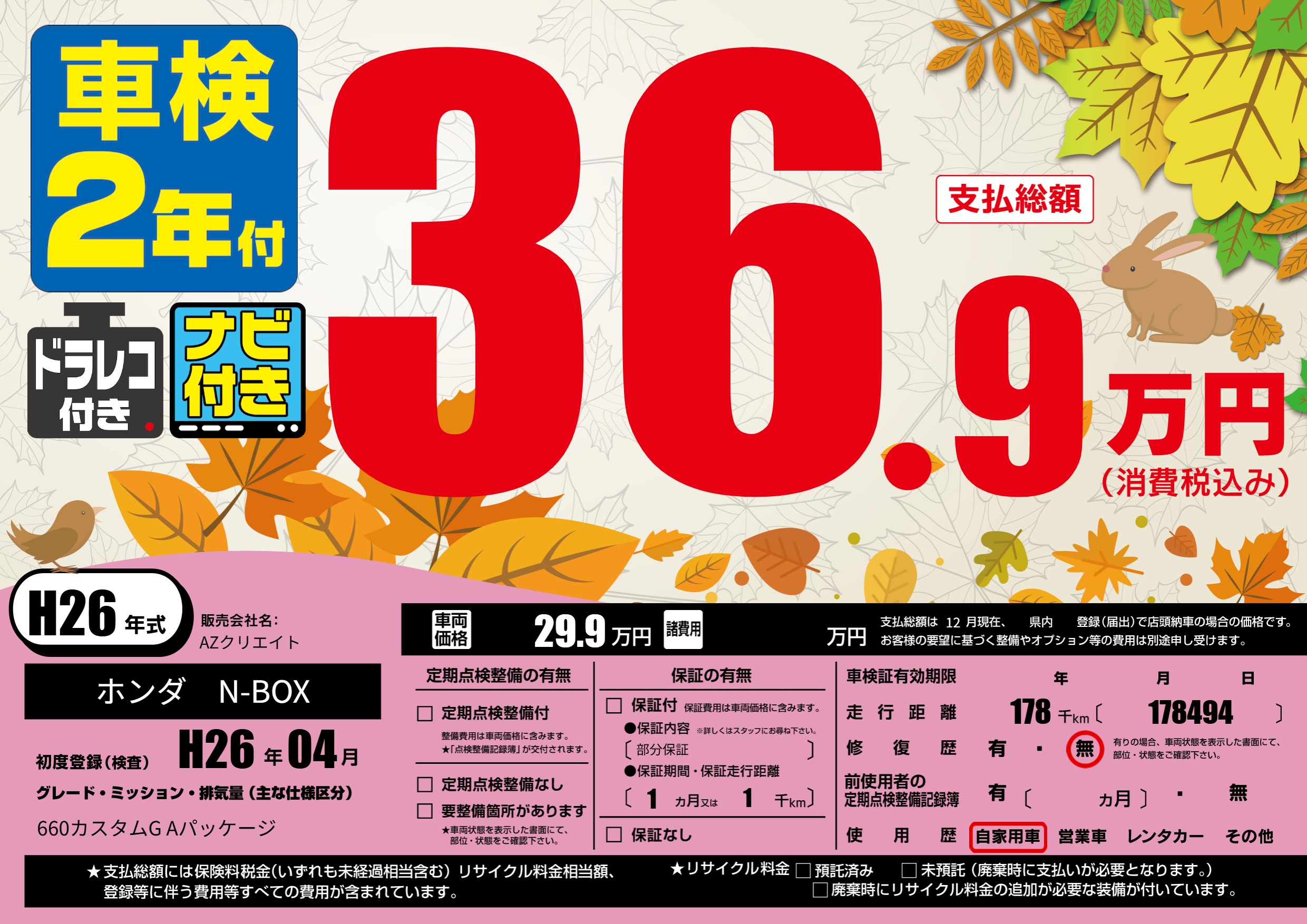 | 走行キロ | 17.8万km | 初年度登録 | H26年04月 |
