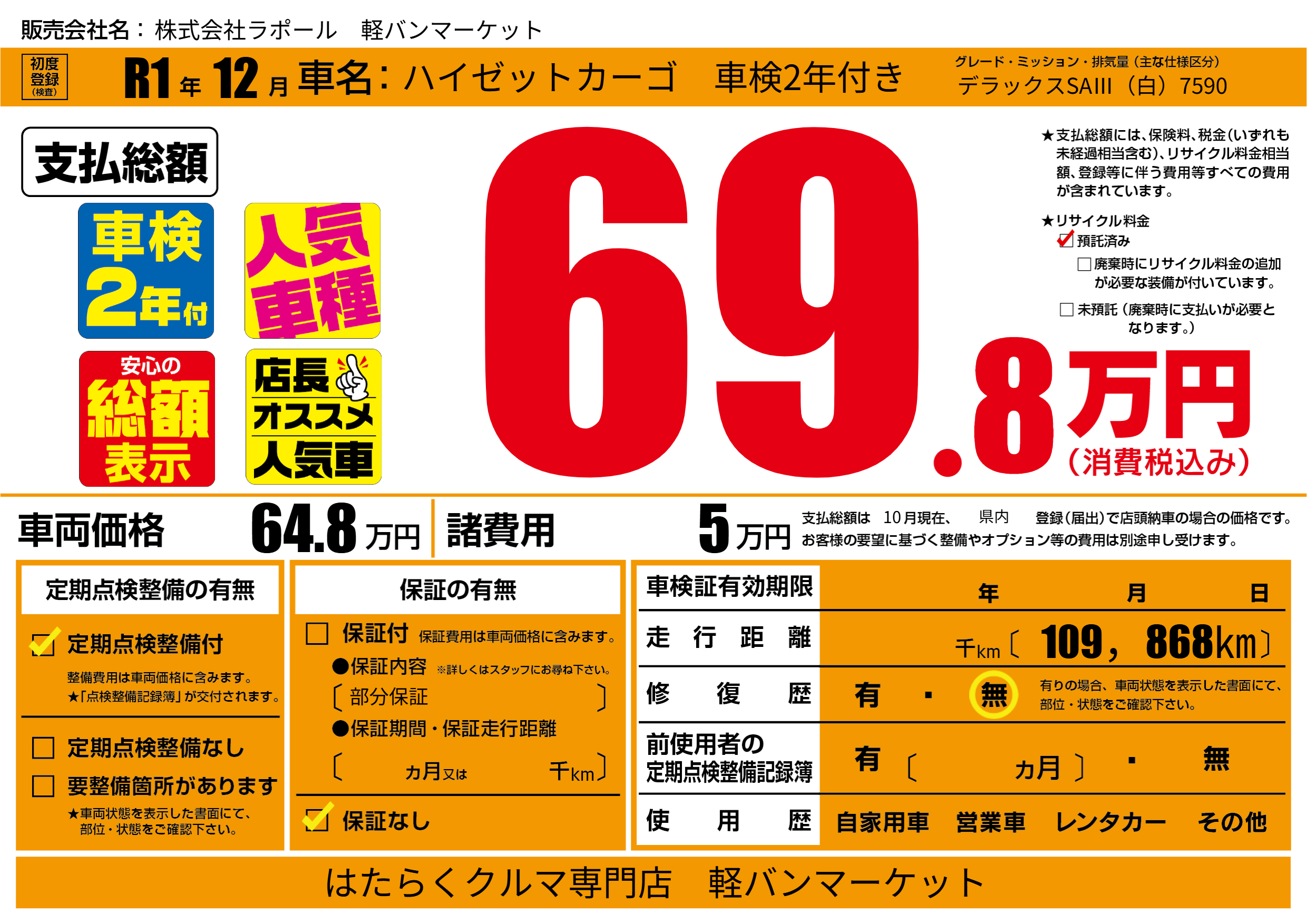 あり | リサイクル預託金相当額 | ( 0円)が別途必要 |