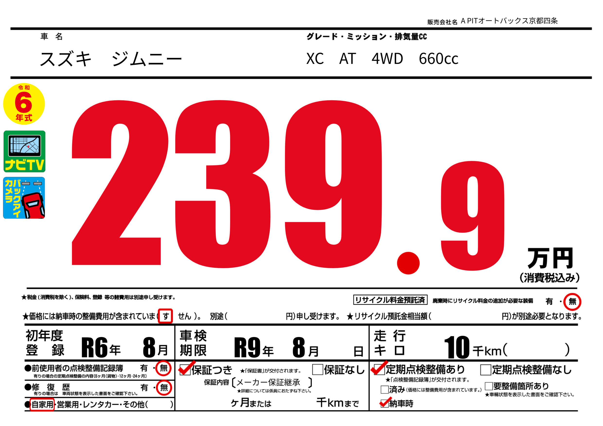 | 車検制限 | R9年 8月 - 日 | ||
