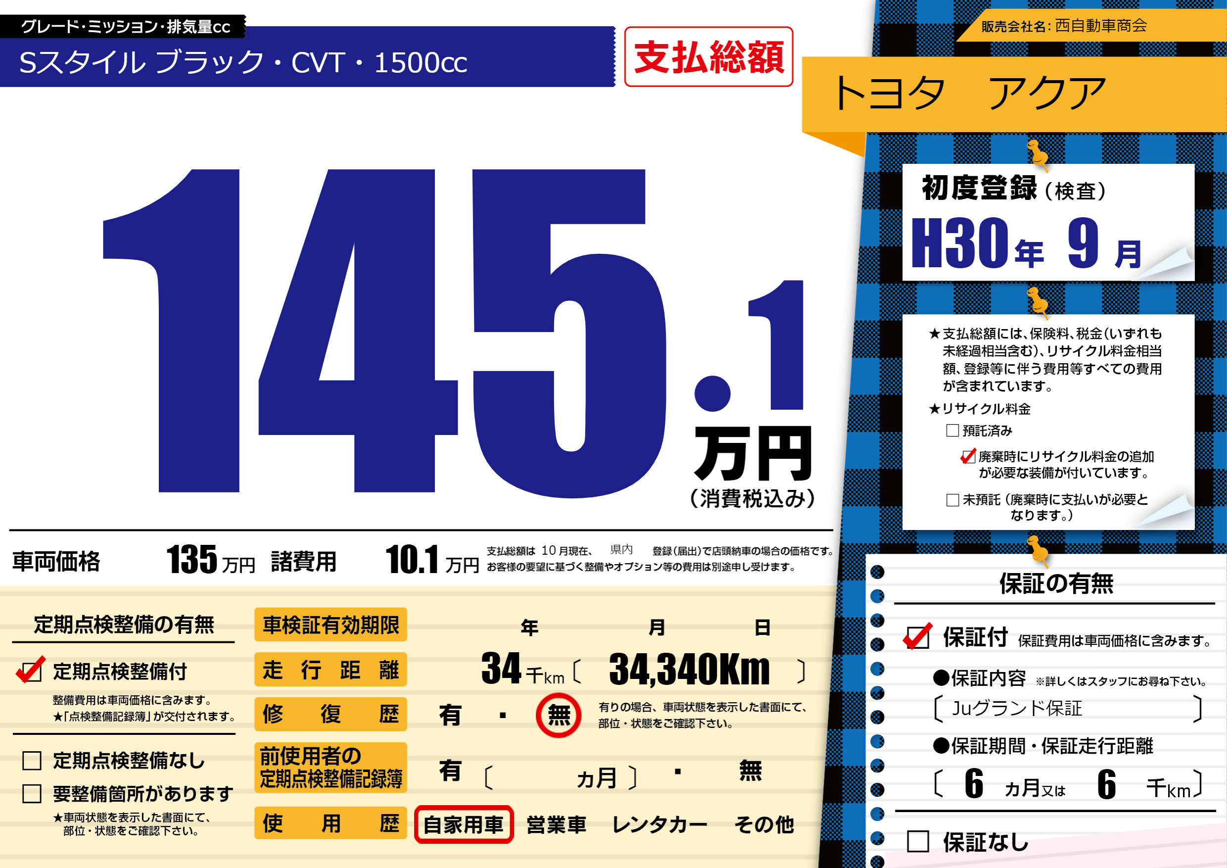 保証付き 保証内容(Juグランド保証) 6ヶ月または6千km |