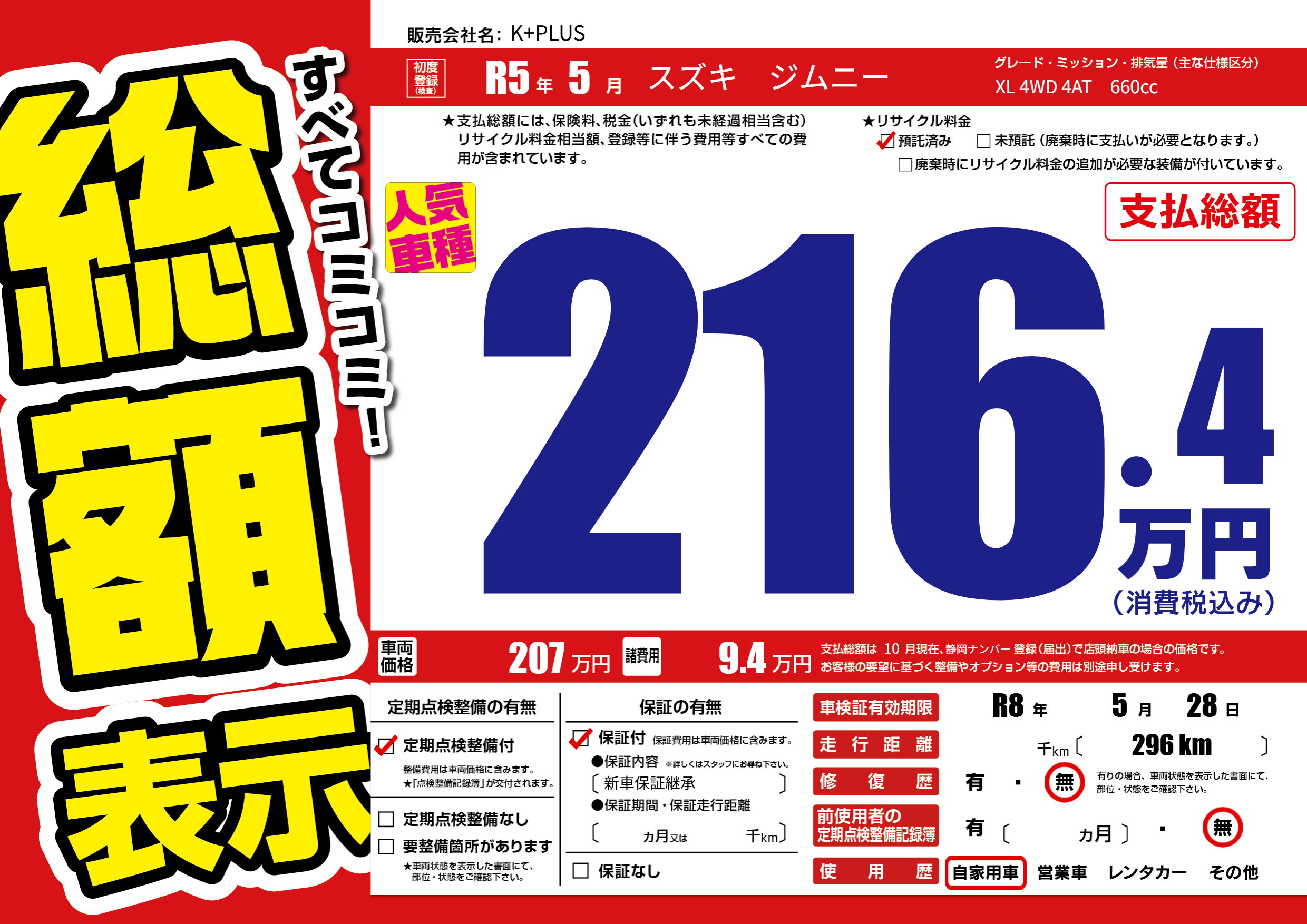 | 車名 | スズキ ジムニー | グレード ミッション 排気量 |