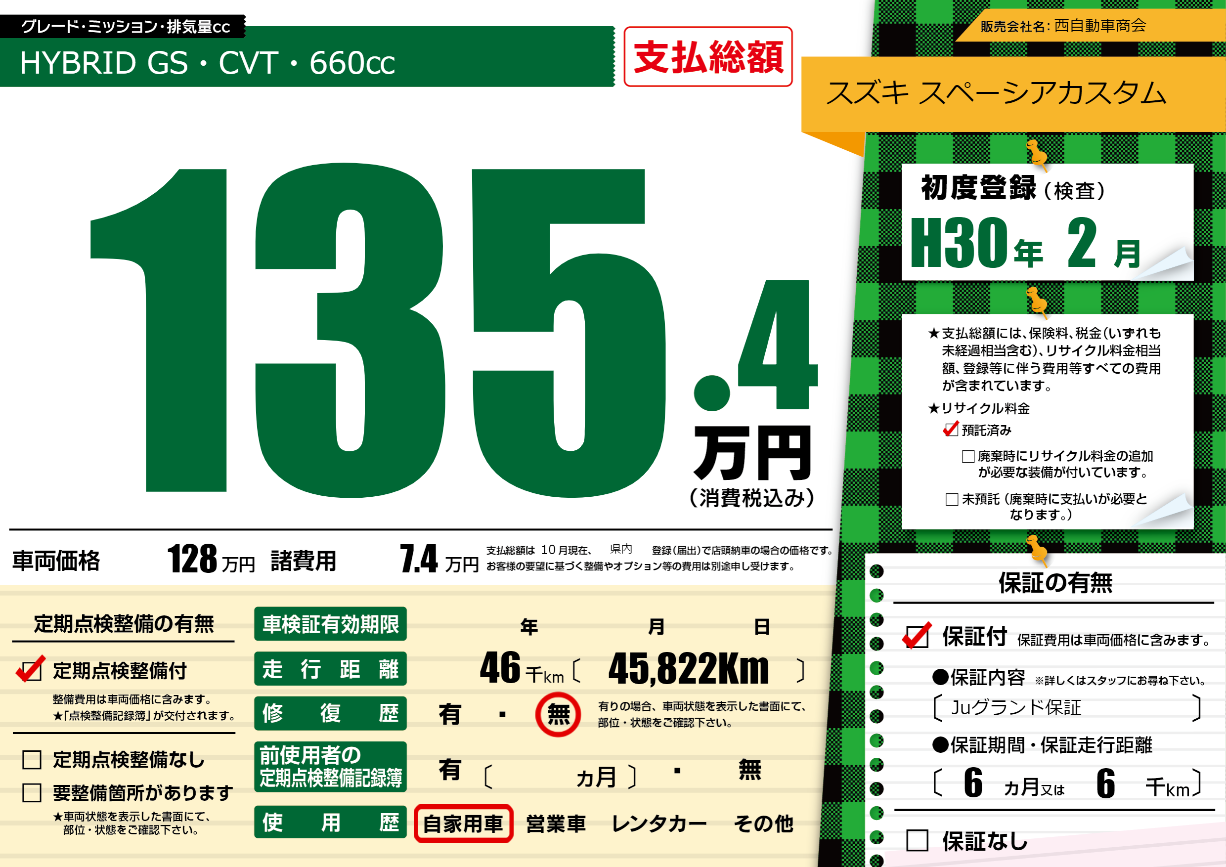 | 車名 | スズキ スペーシアカスタム | グレード ミッション 排気量 |